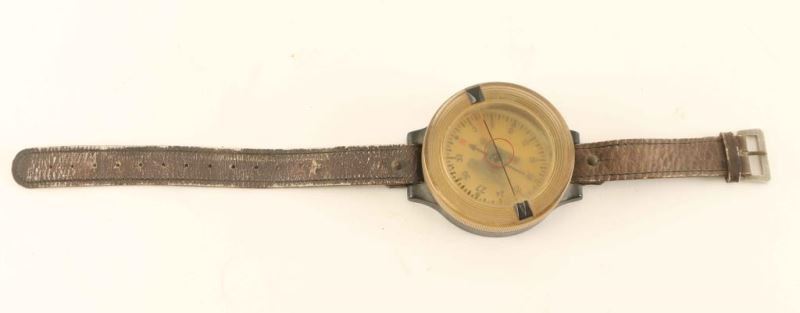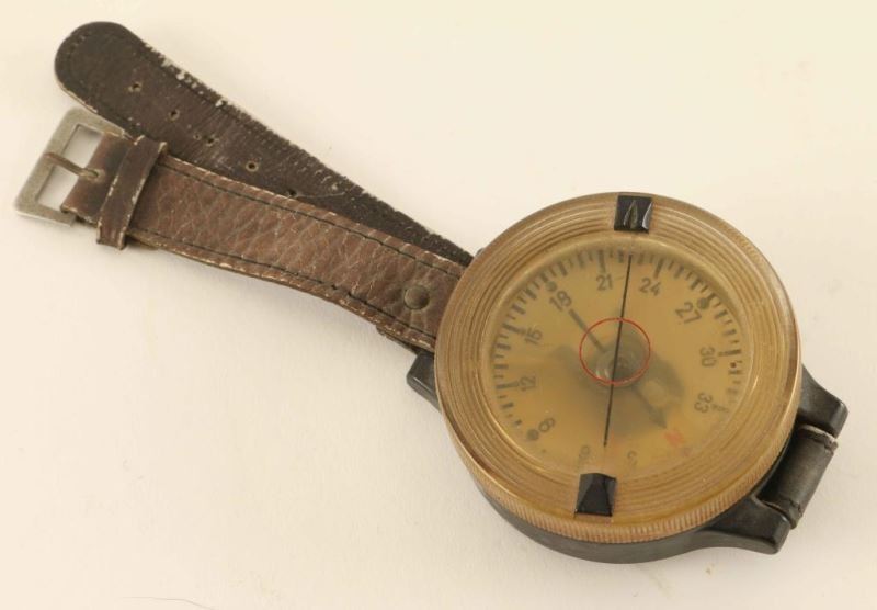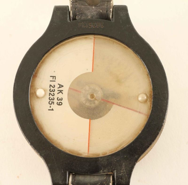 Vintage WWII German Luftwaffe AK39 Aviator Pilot Wrist Compass. Circa 1940s. Leather band with plastic compass. Marked 'AK 39 Fl23235-1' on the back. Compass is 2 1/2"dia. and leather strap shows age.
