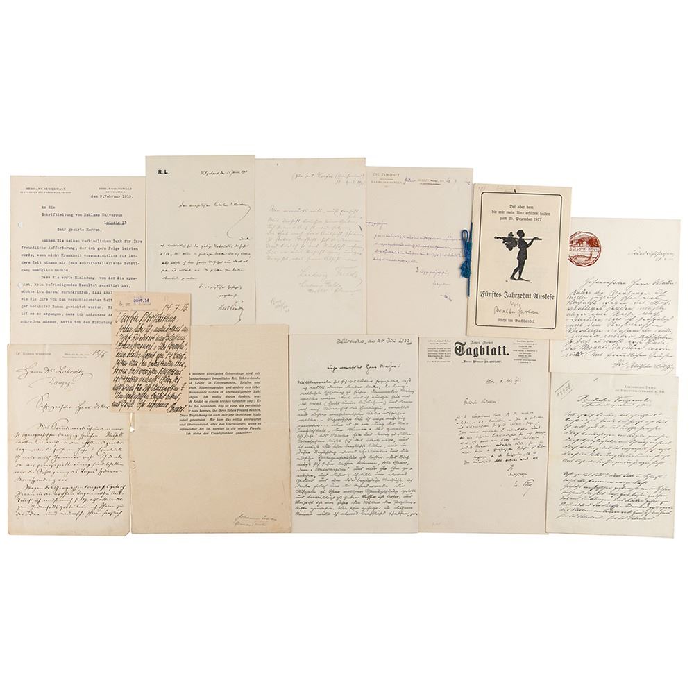 Collection of twelve items signed by German writers of the 19th and early 20th century, featuring dramatists, novelists, journalists, poets, and publishers. Includes: Wilhelm Bölsche (ALS), Michael Georg Conrad (ALS), Ludwig Fulda (ALS), Maximilian Harden (ALS), Walter Harlan (program), Rudolf Herzog (AMS), Josef Lauff (ALS), Rudolf Lindau (ALS), Edward Potzl (ALS), Hermann Sudermann (TLS), Johannes Trojan (TLS), and Georg Wegener (ALS). In overall very good to fine condition.