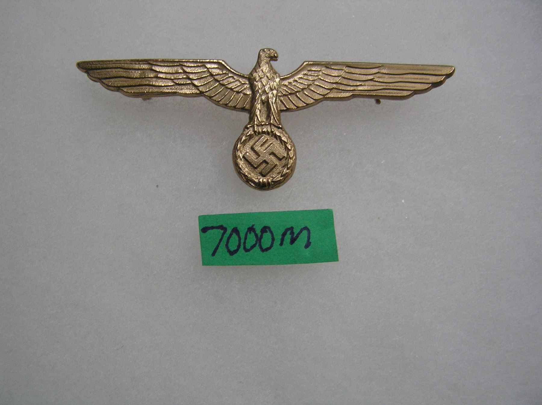 German army breast eagle gold colored with pin back WWII style high quality reproduction collectors, re-enactors,historical or theatrical collectors piece est. value $80.00-$100.00