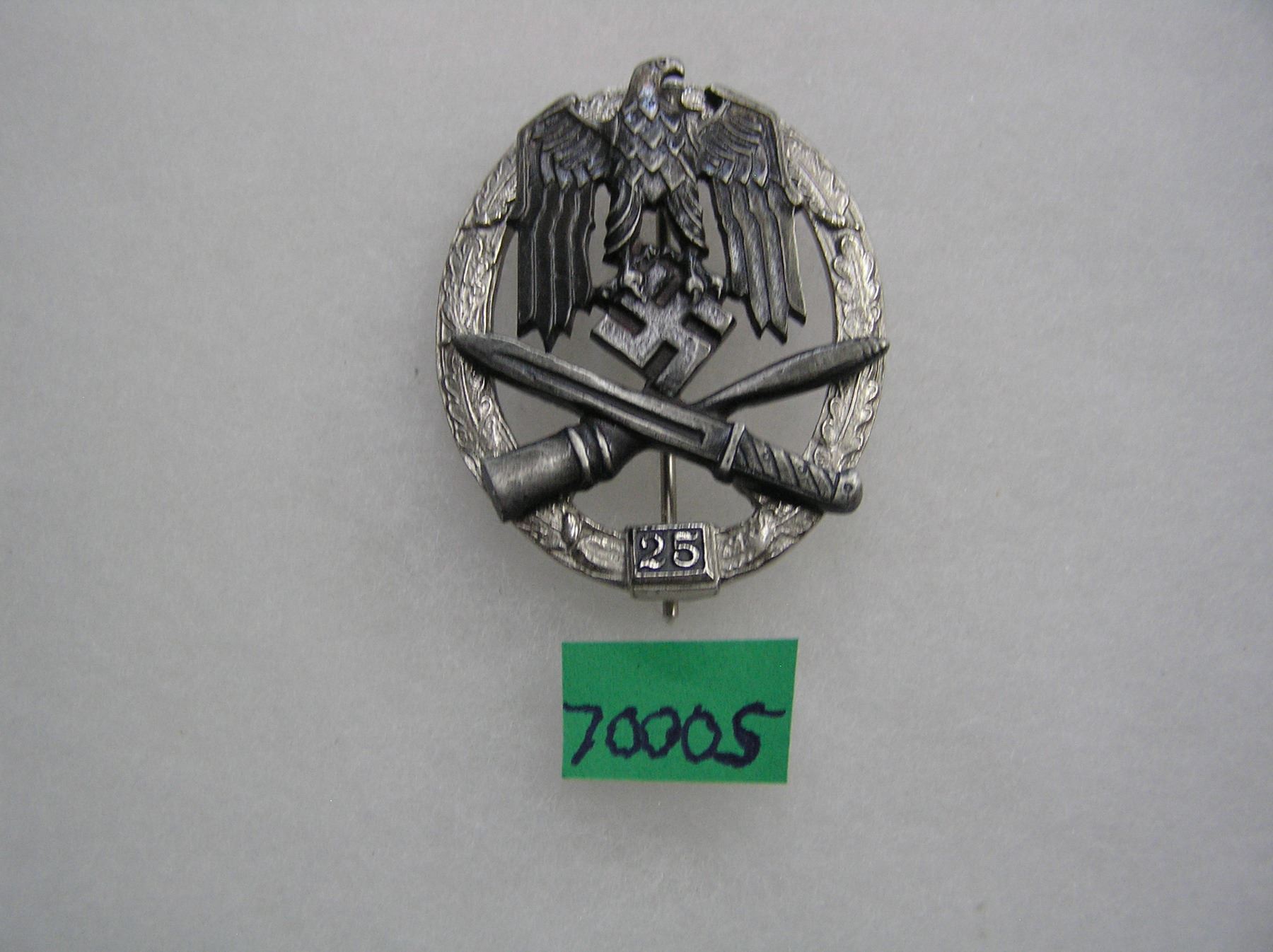 German assault badge for 25 actions in silver and black WWII style high quality reproduction collectors, re-enactors,historical or theatrical collectors piece est. value $75.00-$80.00