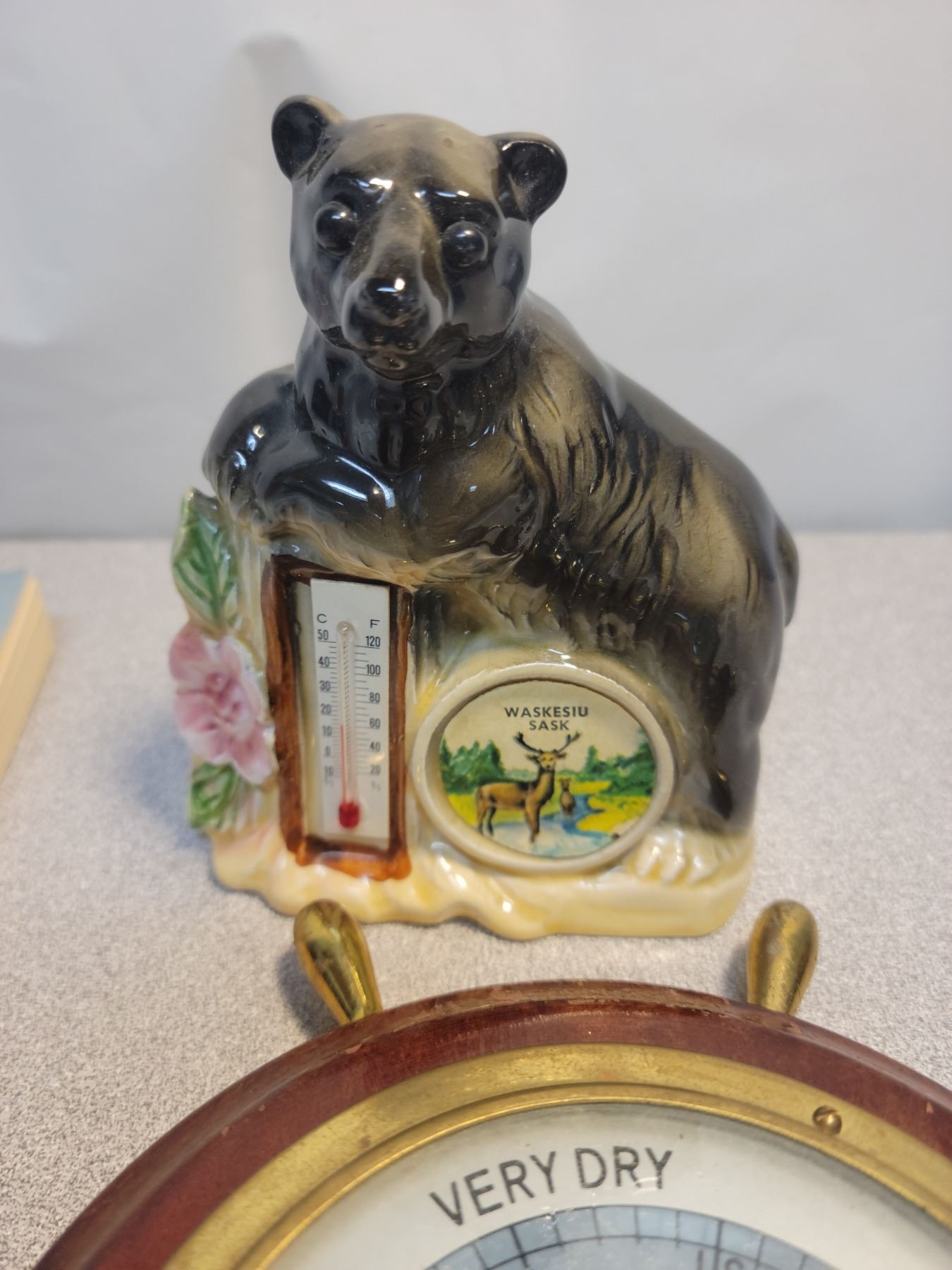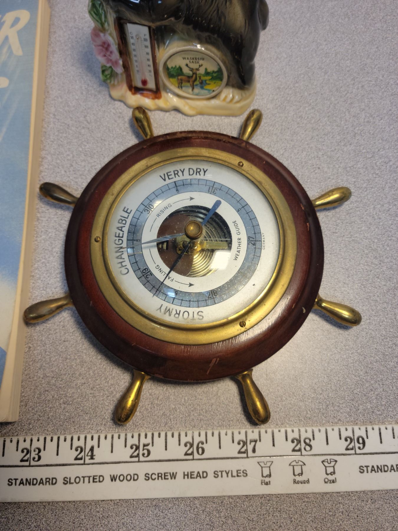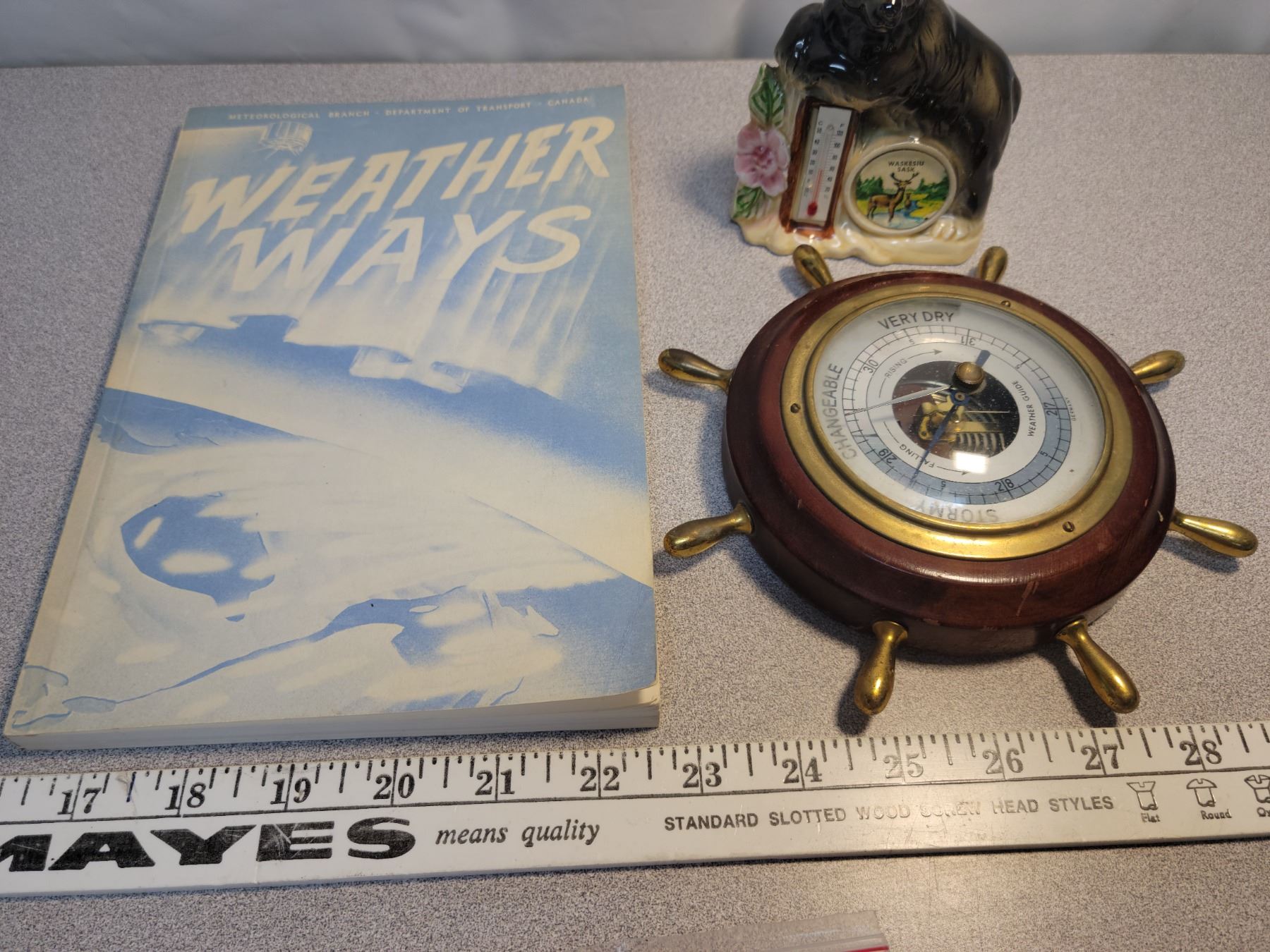 German barometer, Waskesiu thermometer, Canadian Meteorological weather book 1976