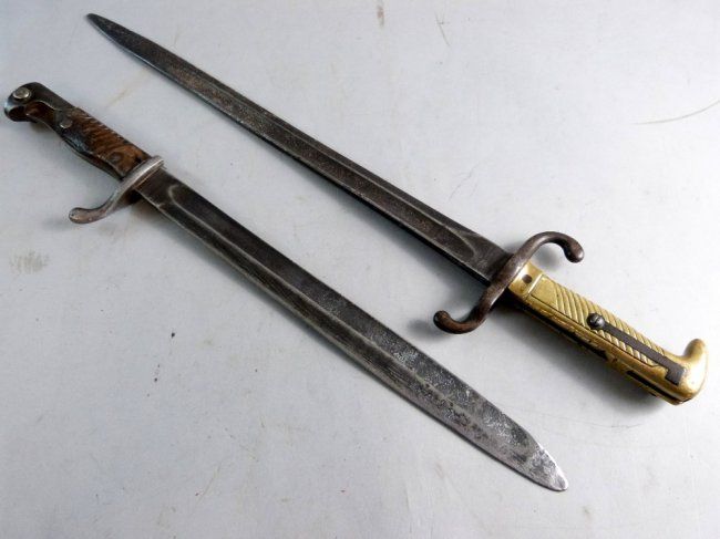 German bayonet with wood handle marked for Waffenfabrik Mauser - A.G. Oberndorf a.m., 21" long and another similar with brass handle 18" long