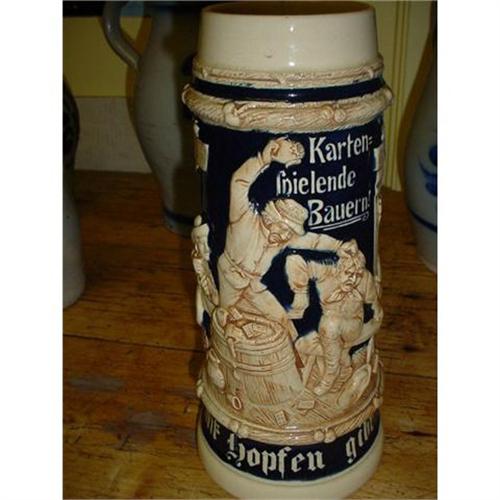 This is a great quality German stein (no lid)which is engraved with scene showing German farmers playing cards. This beautiful and large stein (11") is very ornate. This stein is in very good condition (no chips & no cracks).