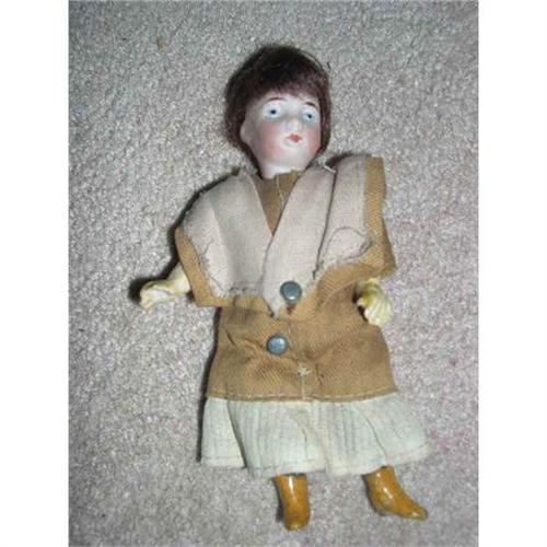 This is an adorable tiny German made doll. She is 5 1/2" tall. She has the bisque head with the painted intaglio eyes. The only number I can make out on the head is 13. She has a piece of mohair for her wig. The dress is old and so cute. She has on only the dress. She has tan/orange painted on heel shoes and then black painted higher up to represent socks! She has a very crude body. She is from a smoke free environment. If you can love her, please bid. Buyer to pay $10 for U.S. shipping, insurance, and handling.