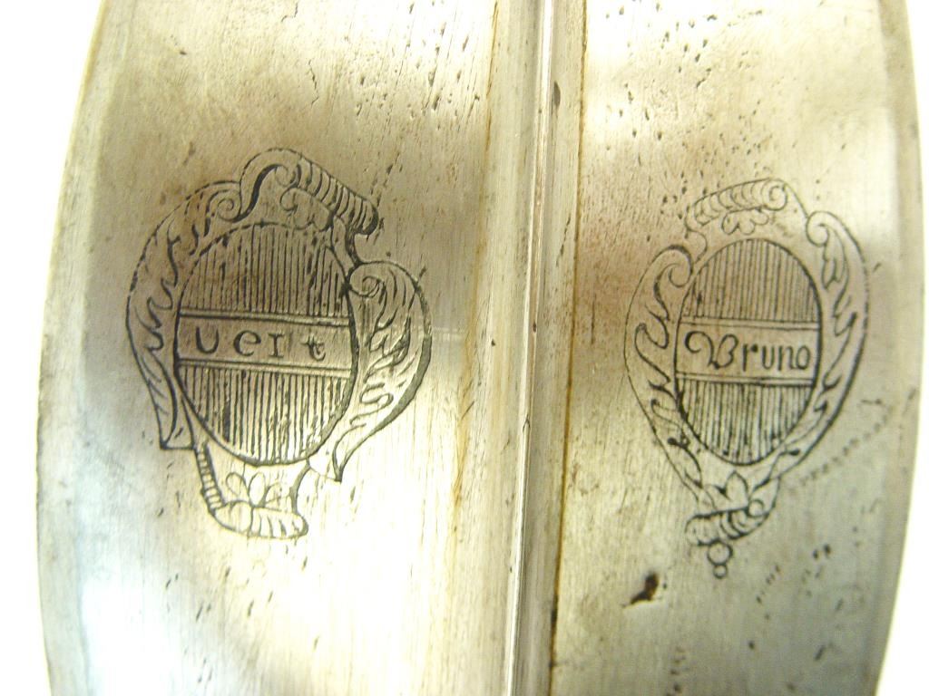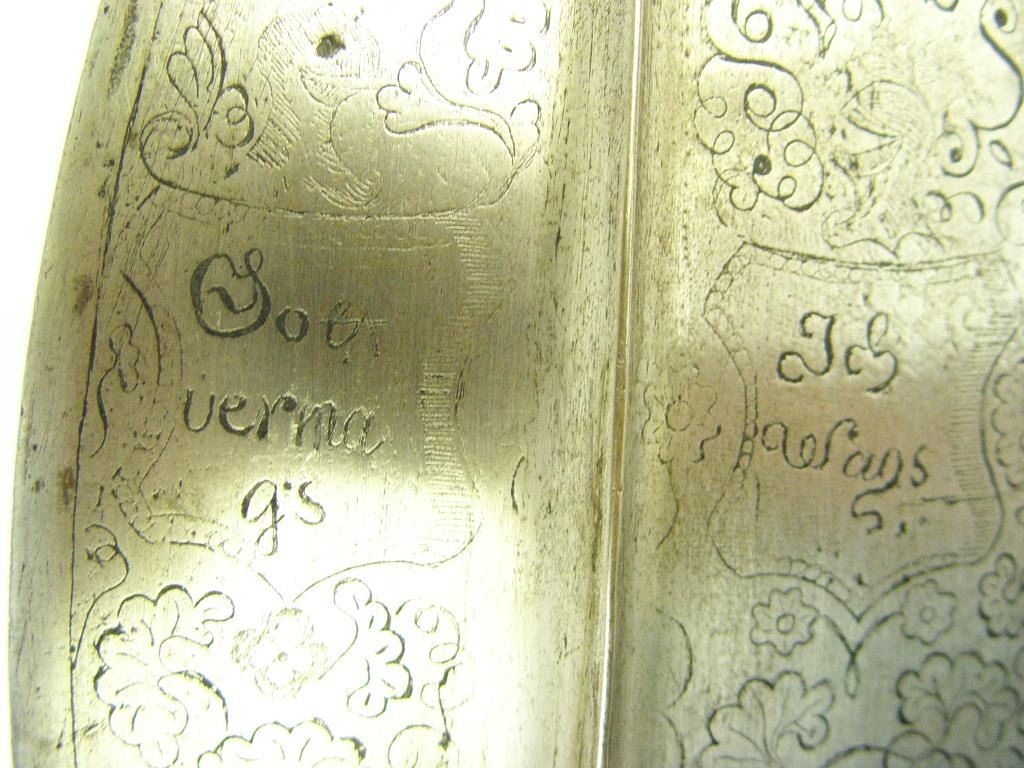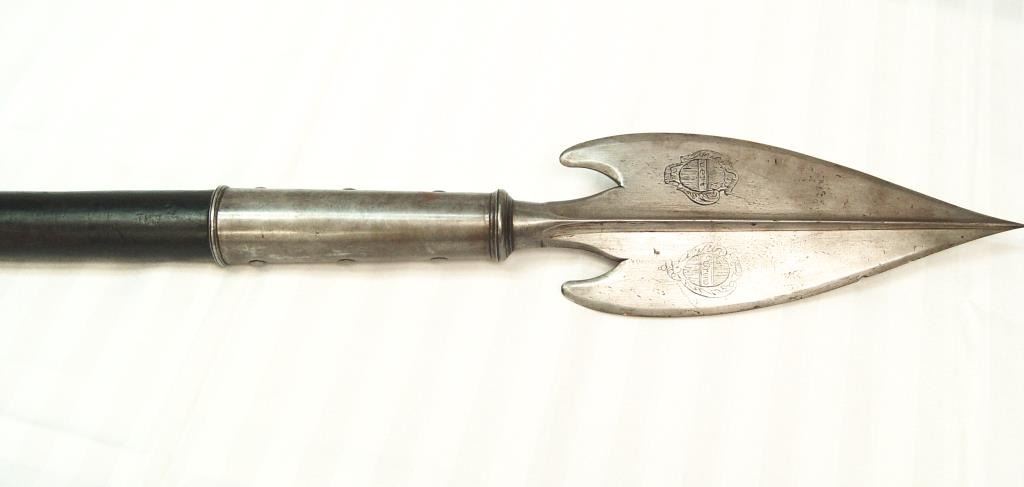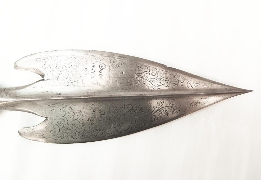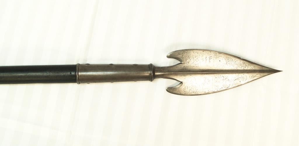 and inscribed head pictured page 122 Stones Glossary and originally in the Metropolitan Museum of Art collection. The metal portion measures 20” by 4 ¾” across the widest section of the blade. The spear measures 87” from tip to the end of the shaft. One panel engraved “Gott Verma, G.S.” and “Joh. Wags”. Two engraved vinettes with “Vert” and “Bruno”. The blade portion is masterfully forged with raised ridges and reinforced construction of heavy gauge. Est.: $1850-3700