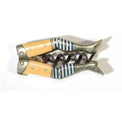 German corkscrew modelled as a pair of lady's legs with celluloid blue stockings and nickel plated boots, 4cm long