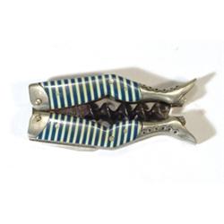 German corkscrew modelled as a pair of lady's legs with celluloid blue stockings and nickel plated boots, 4cm long