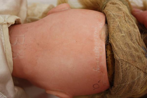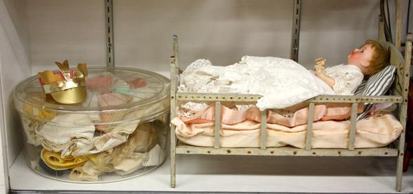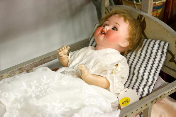 Two German dolls consisting of a Heubach-Kopplesdorf bisque socket head doll with hand-painted facial characteristics, blue sleep eyes, and an open mouth showing two upper teeth on a 10'' composition body, appropriately dressed, resting in a wooden cradle with bedding; together with a bisque socket head doll with hand painted and naturalistic facial features, blue sleep eyes, and an open mouth showing upper teeth on a composition body appropriately dressed, possibly J.D. Kestner, marked B.3., 23''l
