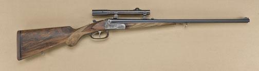 German double rifle signed “P. Bessel & Son, Sagan” (German), 9.3x74 caliber. Blue and case hardened finish, select wood stocks, claw mounted Carl Zeiss Zieomar scope, serial #6508. The rifle shows Krupp Steel barrels,Suhl proofs of the smokeless prewar era. The rifle shows auto-ejectors, double adjustable triggers, crossbolt lock, horn triggerguard, and other classic prewar German motifs. The barrels retain 80-90% original blue that isevenly thinning and toning. The action shows 30-50% case hardening drifting to silvery grey. The stocks have been professionally replaced and are in fine to excellent condition. The gun shows a rounded pistolgrip, monte carlo type cheekpiece, narrow sling swivels for European sling, hard-rubber buttplate. The stock measures 13-7/8” to the end of the wood, 14-5/8” to the end of the hard rubber recoil pad. The wood is of select burl walnut, finely checkered, well made, and in keeping with a fine European styling by a master gunsmith. The action is tight, the bores near excellent. A quality prewar German rifle in a good caliber. From the