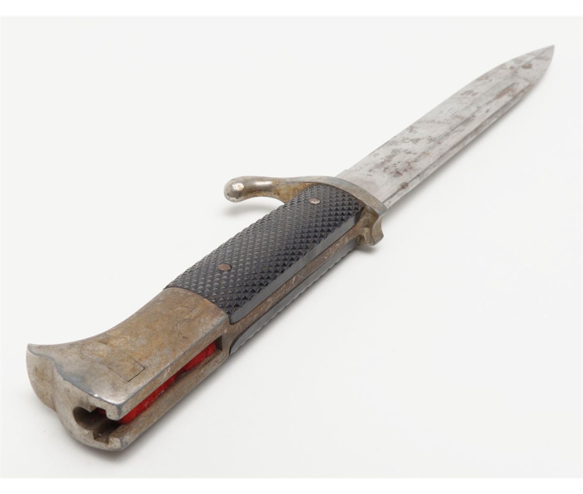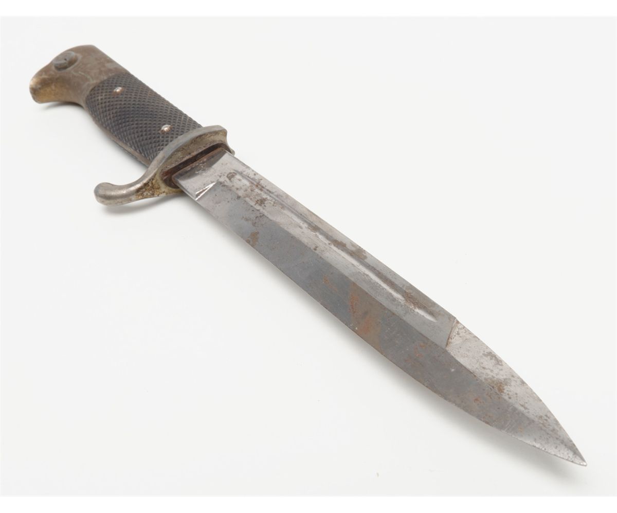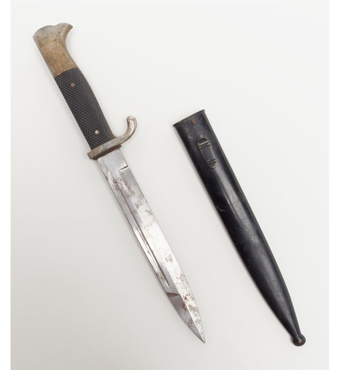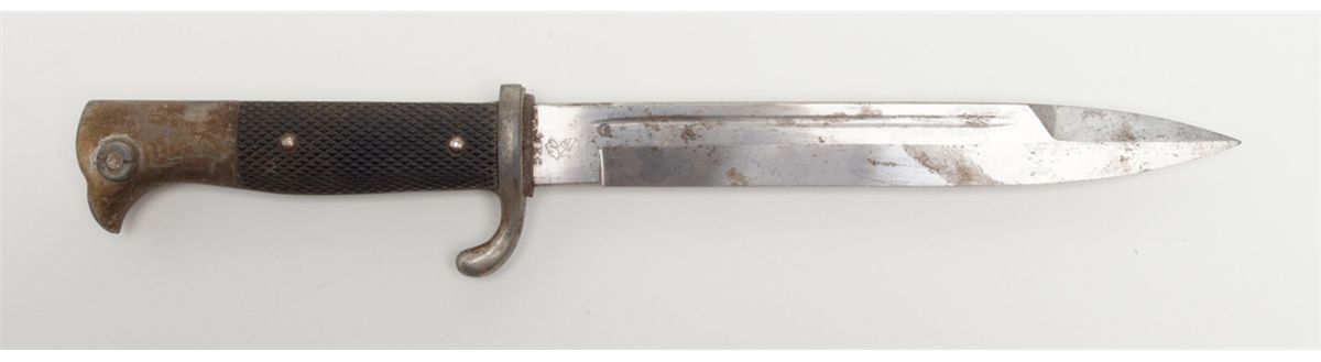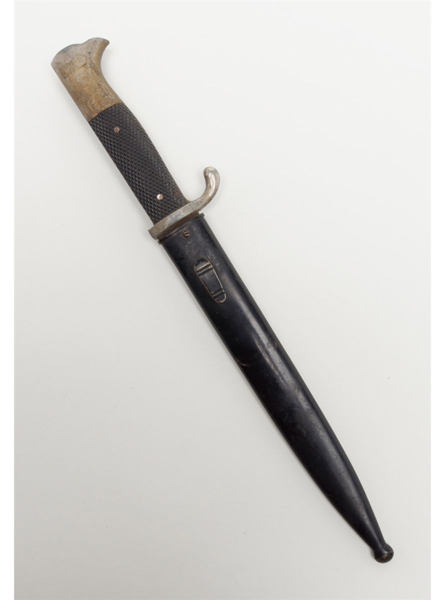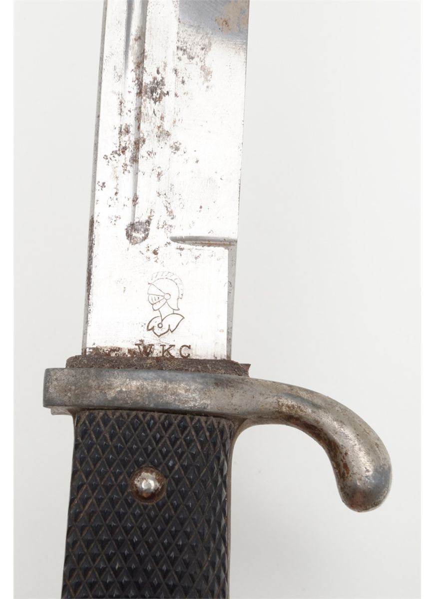 German dress bayonet showing Knights Head makers mark with W.K.C. initials which was a Soligen, Germany maker. The blade is good with some slight staining that would clean. The mounts grip and scabbard are also good. The bayonet shows a piercing type tip or point. Est.: $75-$150