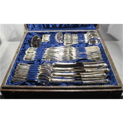 8 Dinner Forks 8.1/2". 8 Dinner Forks 7". 8 Salad Forks 6". 8 Dessert/Soup Spoons 7.1/4". 8 Teaspoons 5.1/2". 8 Butter Knives 6.1/2". SIX Demitasse spoons 4.1/2". Ice Cream Knife 10". Ladle 12.1/2". Pie Server 9.1/2". Petit Four Tongs 7.1/2". Gravy Ladle 6.1/2". 3 Serving Spoons 8.1/2". Mashed Potato Spoon 8.1/2". Preserve Spoon 5.1/2". All in the original two layer fitted original box. Purchased in 1955 in Germany and only occasionally used. The box has aribbon across one corner on the inside that states,"Karl Kimmel, Solingen Germany. Cutlery of all kinds" This set appears to be silver plate. There is no loss of plate on any of the items and only minor evidence of use.