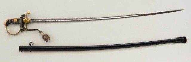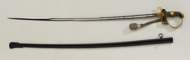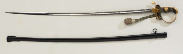 German imperial era sword with miner’s type pick and hammer on cross guard showing etched blade in very good condition with scabbard and sword knot. The blade shows most of its original finish and etching with slightspotting and minor aging. The scabbard shows 90% original paint; the grip is very good + to near fine. Est.: $175-$350.