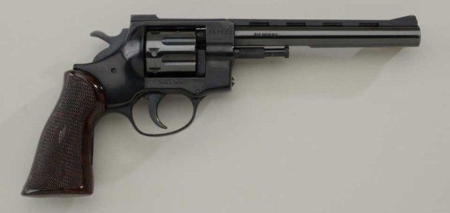 German-made Arminius DA revolver, .22 Mag. caliber with extra .22LR cylinder, blue finish, 6” ventilated rib barrel, black finish, checkered mottled brown plastic grips, #747722 with Mexican leather holsterall in overall fine condition. Est.: $100-$175.