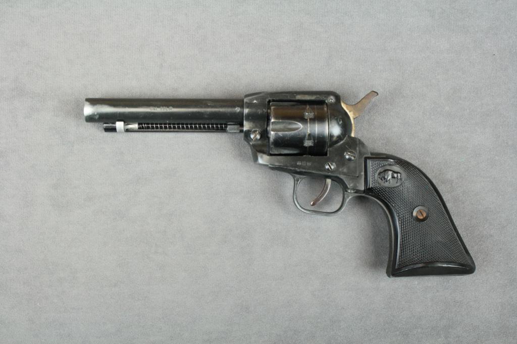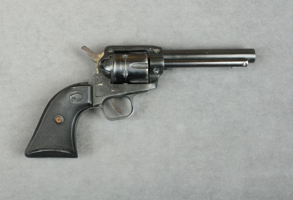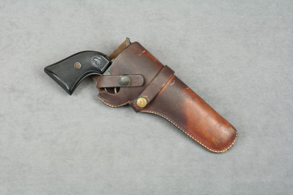 German-made copy of a Colt SAA revolver,  .22LR cal., 4-3/4” barrel, black finish,  checkered hard rubber grips, #112296. This  gun is in overall good condition showing the  majority of its finish remaining, goodaction, fair bore, grips good although the  right grip is somewhat warped at the front  top area; accompanied by a hunter brown  leather holster.  Est.:  $75-$150.