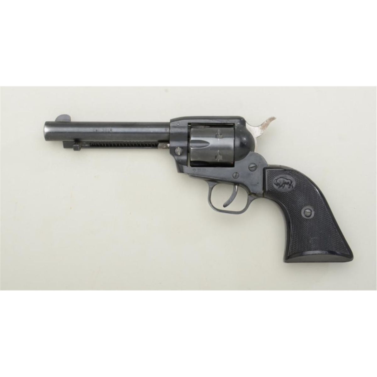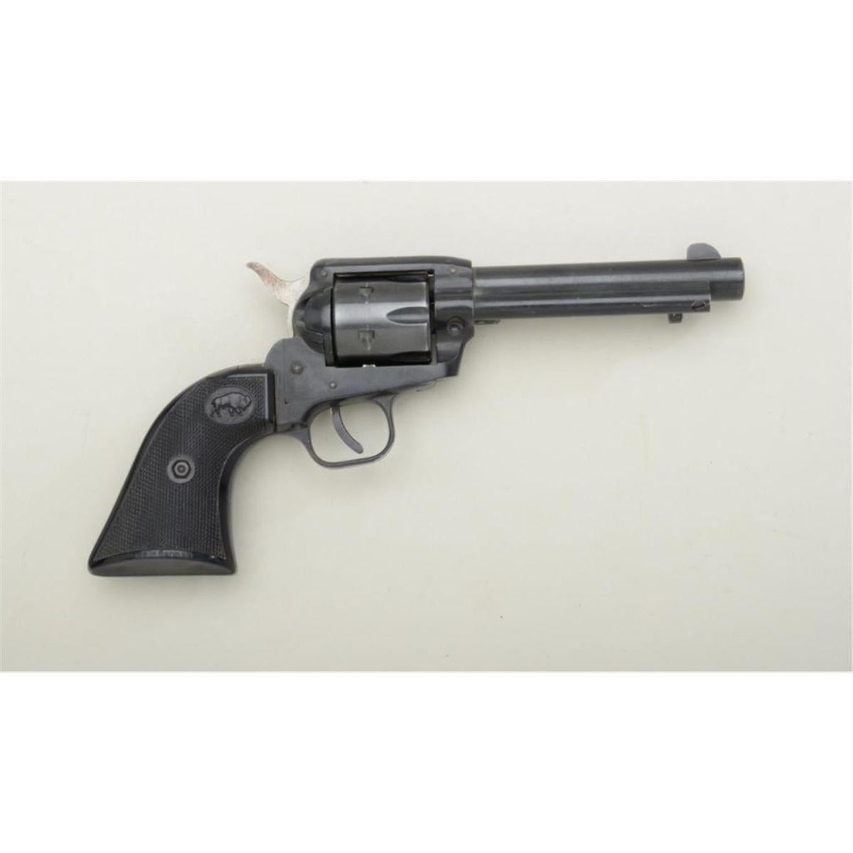 German-made copy of a Colt SAA revolver, .22LR cal., 4-3/4” barrel, blue finish, checkered black hard rubber grips with buffalo at top of each grip, #263512. This gun is in overall good condition with a lotof finish, good bore, action and grips. Est.: $75-$150.