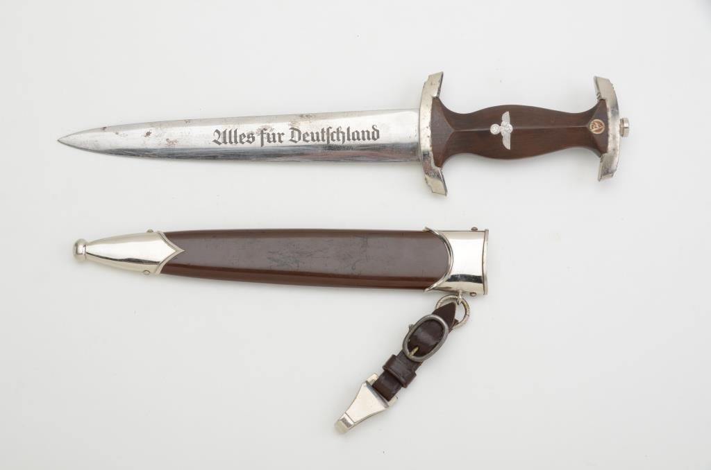 German nazi SA dagger with sheath and hanger, RZ blade dated 1941 in overall good condition; one side of blade marked “Ulles fur Deutschland”. Est.: $250-$500.