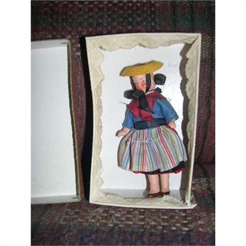 Minature German painted bisque doll in original box. This dolls represents Hamburg. It's stamped in the box. The girl is tied in her box with original stringing and the original price sticker of 25 cents is on the box bottom. She has moveable arms and legs. She has painted on brown slipper shoes. This item is from a smoke free environment. Buyer to pay $10 for U.S. shipping, insurance, and handling. Thanks for viewing.
