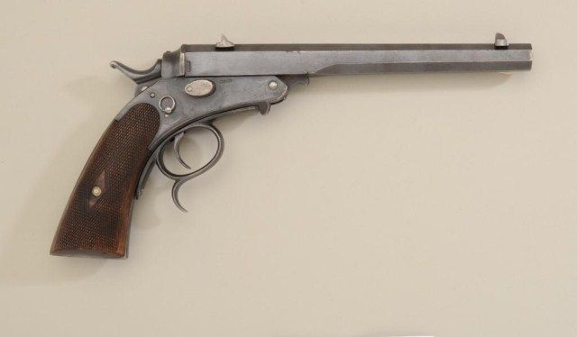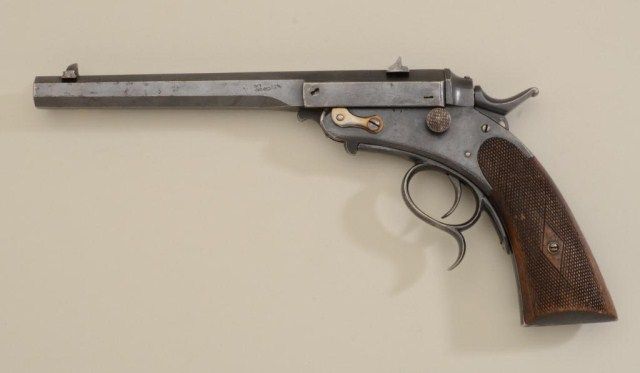 German single shot tip-up Steven’s type pistol, .22 cal., 8” octagon barrel, blue finish, checkered wood grips, #ING489. This gun is in overall very good condition showing considerable original muted blue finish,fine bore and action, good grips. Est.: $175-$350.