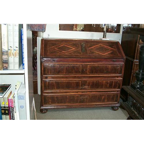 Inlaid labornum and walnut veneered slant front bureau on line inlaid bun feet. Key.