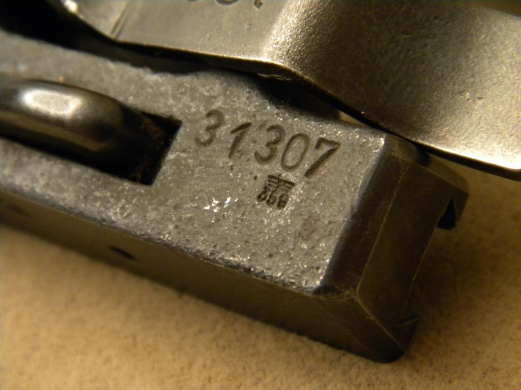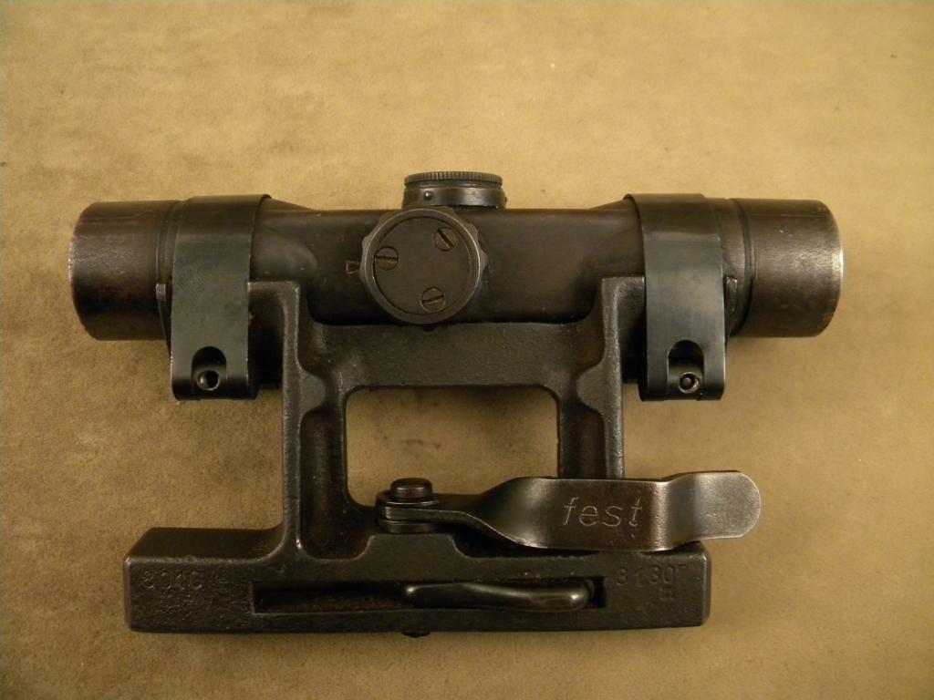German sniper scope marked G.W. 2F4 #31307 and DDx.(triangle) with matching Nazi proofed mount also showing #31307 and 8010 at rear of mount spring band retainers. 85-95% blue, near excellent, good optics. Est. $400-800