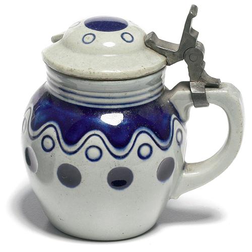 German stein, miniature form with an incised design in blue over a gray matt glaze, numbered 2087,3.5in.h, minor chip to lid