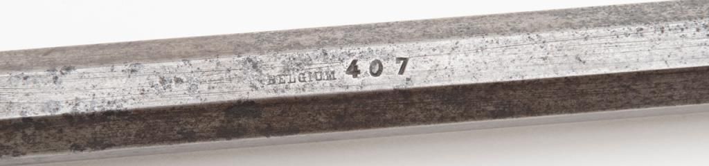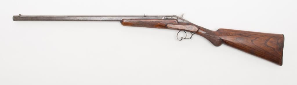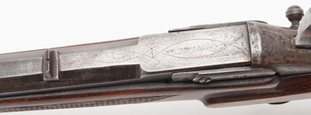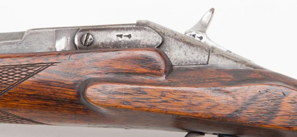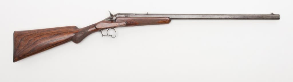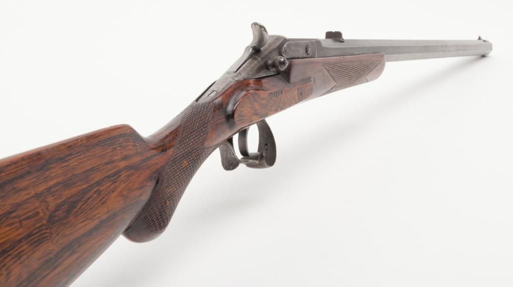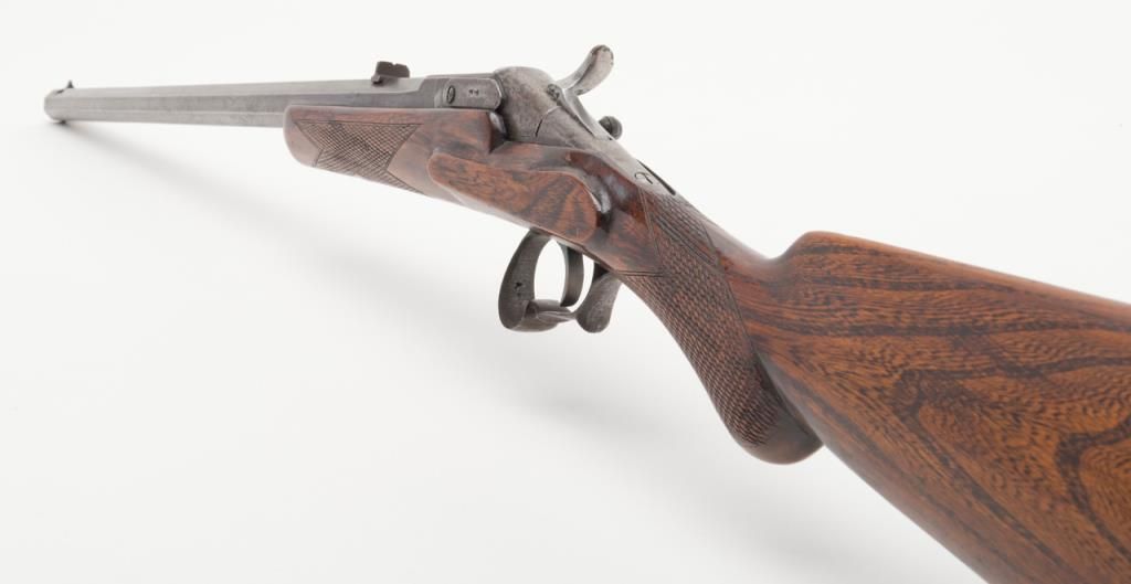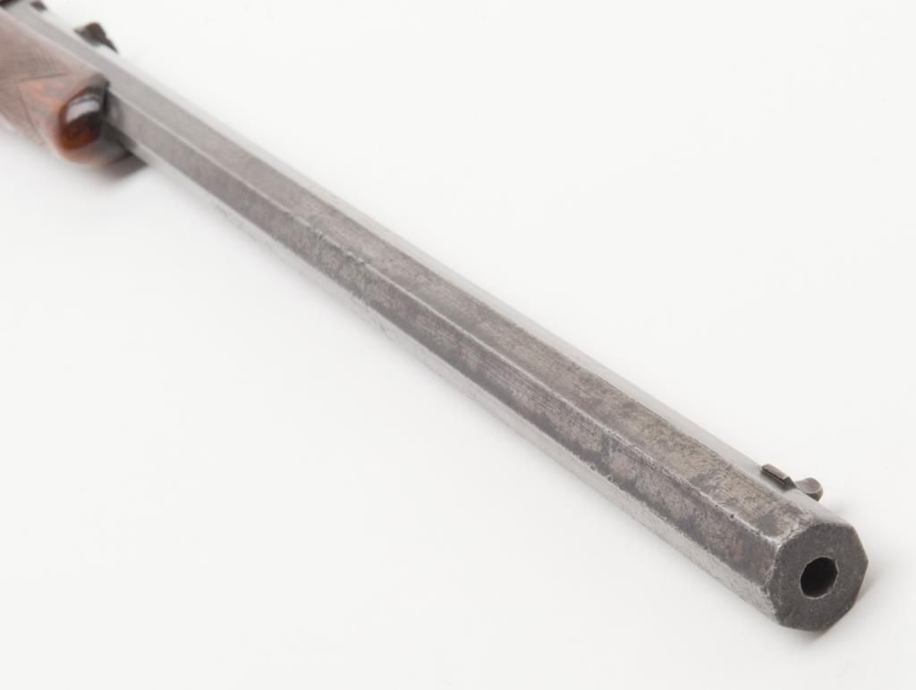 German style Flobert single shot rifle, approximately .30 caliber, Serial #NSNV. The rifle is in overall good condition with a 24” octagonal barrel. The barrel retains little of its blued finish with the majority going to a grey patina. The action is all brown, with gold engraving work on top of the action. The finely checkered wood stocks have been re-finished with an additional coat of varnish, also featuring a Prince Edward pistol grip and checkered hardrubber butt plate. The bore is good, action crisp and markings legible. (Antique). Est.: $150-$300.