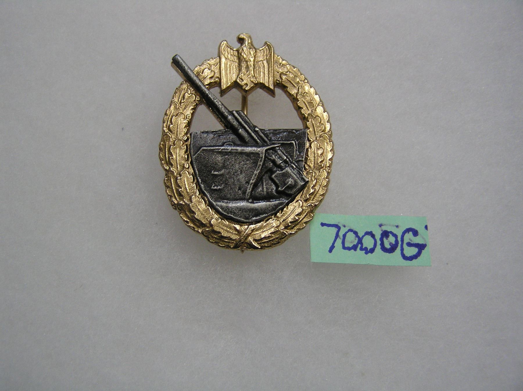 German war badge for the coastal artillery in gold and silver WWII style high quality reproduction collectors, re-enactors,historical or theatrical collectors piece est. value $75.00-$80.00