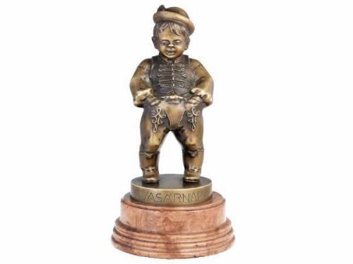 Boy in nice clothes. Cast bronze with patina on marble base. Size: 23.5 cm