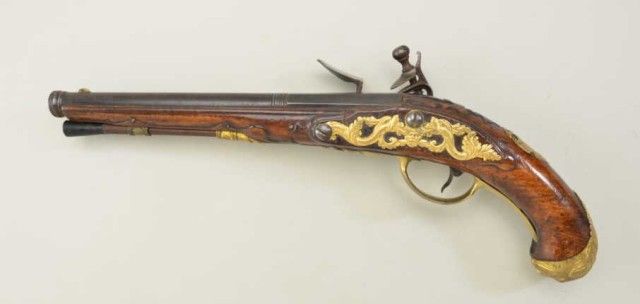 Germanic Flintlock pistol, circa 1700-1750 with ornate cast brass mounts that are gold gilted and early banana shaped lock. The butt cap shows a stylized lion head and beautiful side plate with dolphins, scrolls,grotesque face. The plaque at wrist shows a beast with mans features and scrolls. The pistol is in an original good to very good condition showing a brown patina finish on the lock and barrel with some minor pinprickpitting. The stock is nicely carved and molded and remains in very good condition. The mounts are sharp and show strong traces of gold gilt. The pistol measures 15-1/4" overall, the barrel measures 9-1/2" with aringed canon style muzzle in 60 caliber. The top jaw and screw are excellent replacements. The stock is very good plus with some small losses and minor imperfections. A handsome pistol withinteresting butt cap. Est.;$1,750-$3,500.