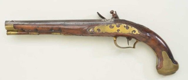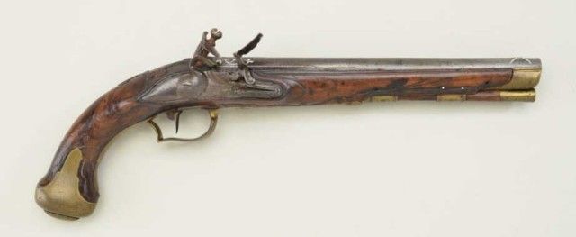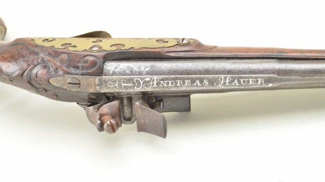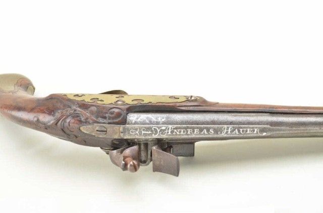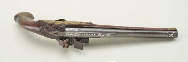 Germanic Flintlock pistol with barrel signed "J. Andreas Hauer" in silver 16" overall, 9-1/4" barrel of 46 caliber smooth bore, plain brass mounted with nicely carved and molded select wood stock. The pistol dateslate 18th to early 19th century. The condition is good to very good with gray patina finish, some light erosion and pitting on the barrel but generally good metal surfaces. The pistol is in its originalFlintlock configuration with just an old replaced top jaw and screw. The stock shows a few scratches but is generally very good with nice carving in high relief around the tang. There are small losses of wood thatare very minor. Est.;$1,250-$2,500.