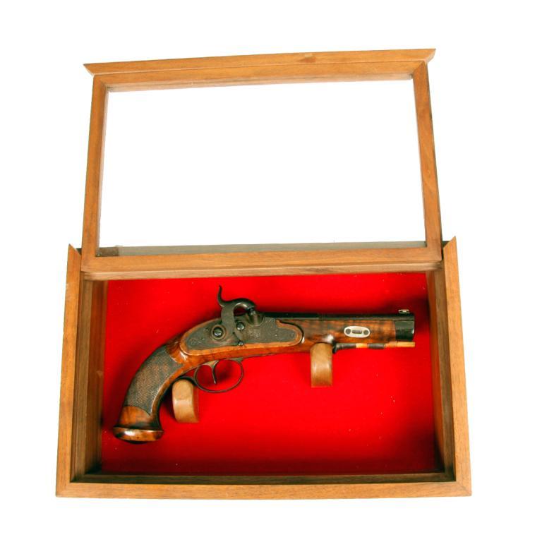 Germanic Percussion Cal .50 SN:NVSN Early Germanic origin percussion pistol with rifled bore. Marked "L,KING in HALBERSTADT" in silver on barrel. 12" overall with 6" barrel, finely checkered hardwood stock. Condition: Good to very good overall with shadow box type display box.