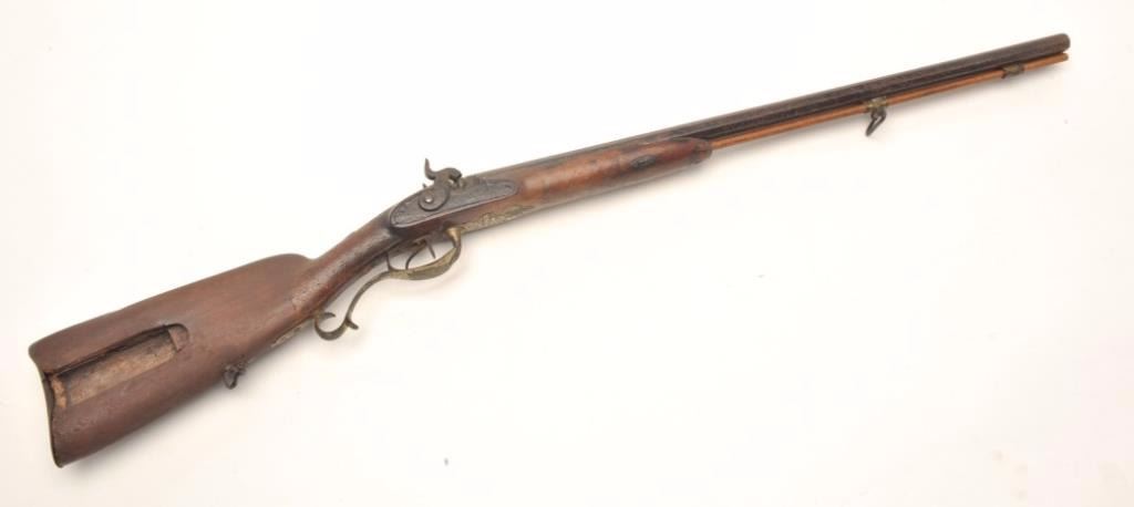 Germanic Side by Side percussion S x S circa 1800 converted from flintlock. The gun is in rusty relic condition with 27ā octagon barrels showing considerable rust and surface erosion. The stock shows abeautifullyornate brass trigger guard, inlay and decorative checkering. There is an escutcheon plate behind the tang with the letter āJā. An interesting wall hanger. Est.: $150-300. (Antique).