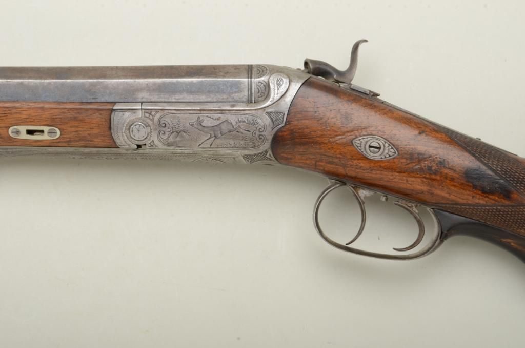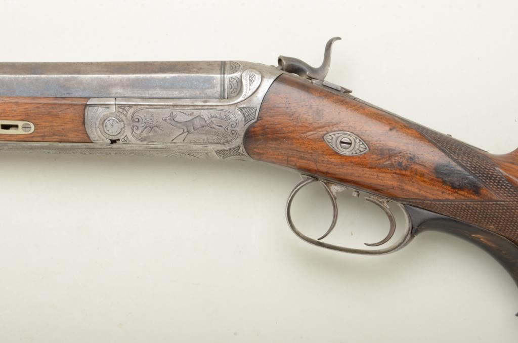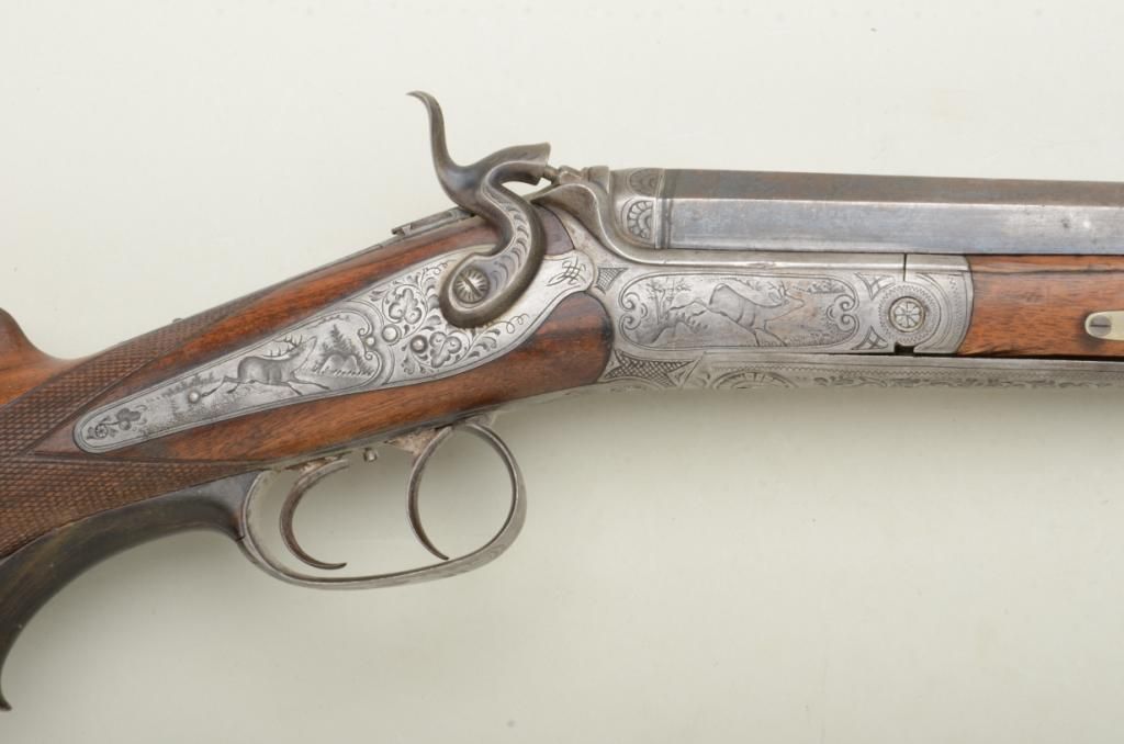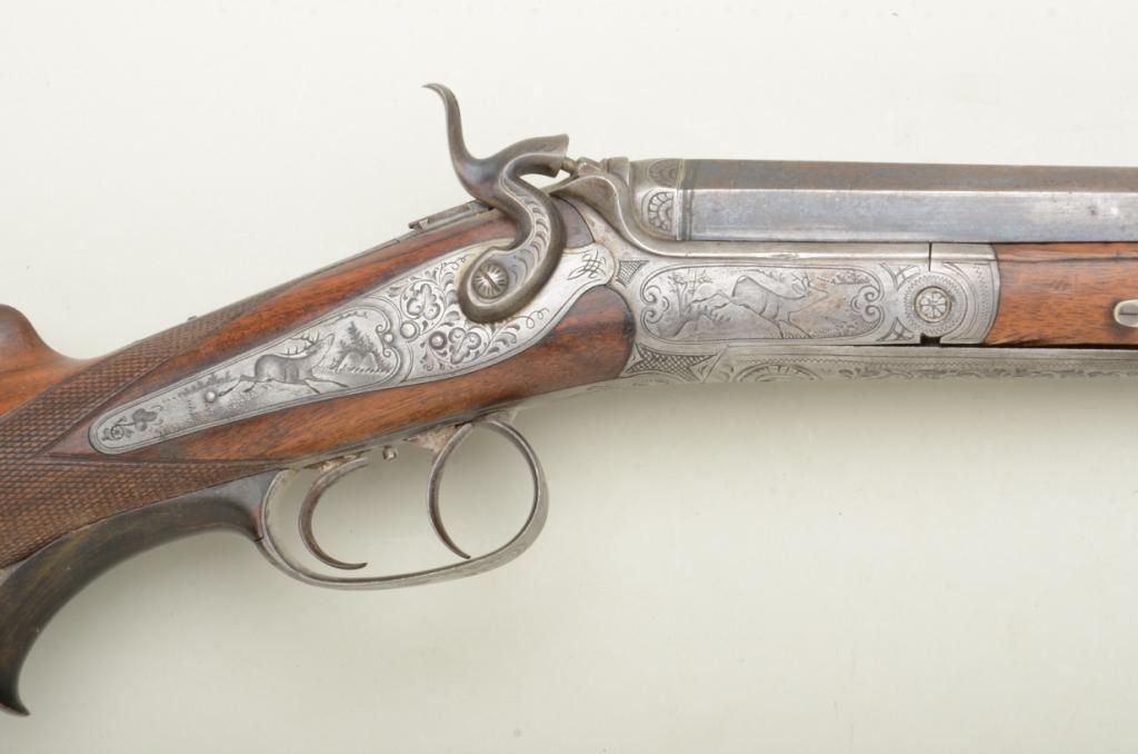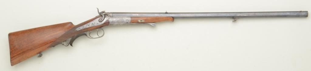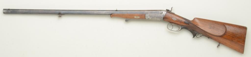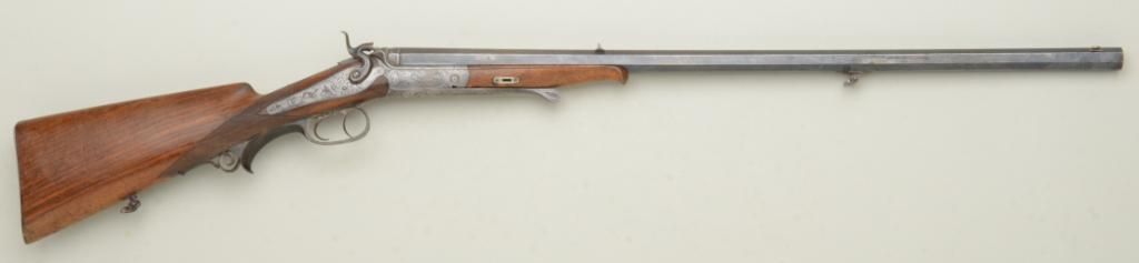 Germanic Single Shot rifle, approx. 50 cal., 27-1/2” octagon barrel, blue finish, engraved frame and back action lock plates, double set triggers, sling swivels, under barrel release lever, wood stocks, #NVSN. This gunis in overall good to very good condition showing approx. 50% muted blue on barrel; four panel game scenes within the artful engraving patterns; strong traces of case color on the engraved hammer; flip-up rearsight; good action, set trigger working at time of description, very good bore; fancy horn base to trigger guard; fore stock missing key (easily replaced). Est.: $600-$1,200.