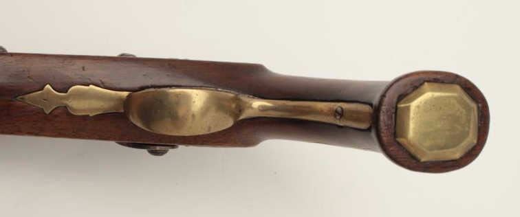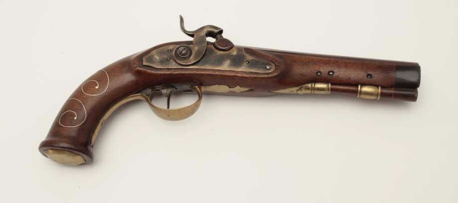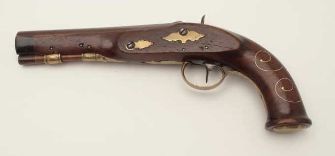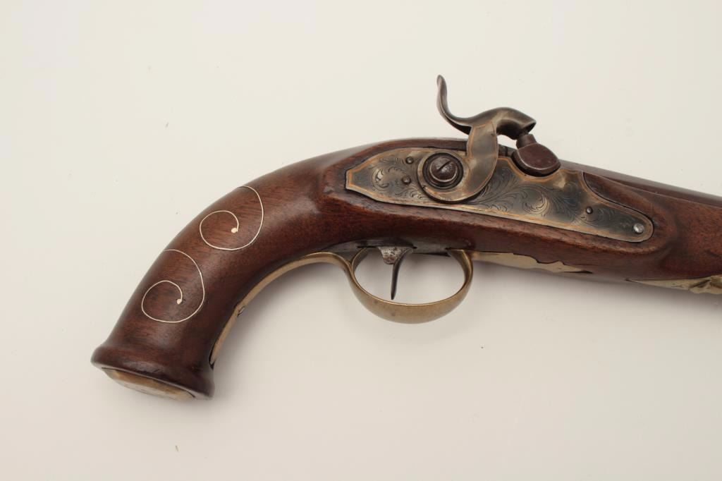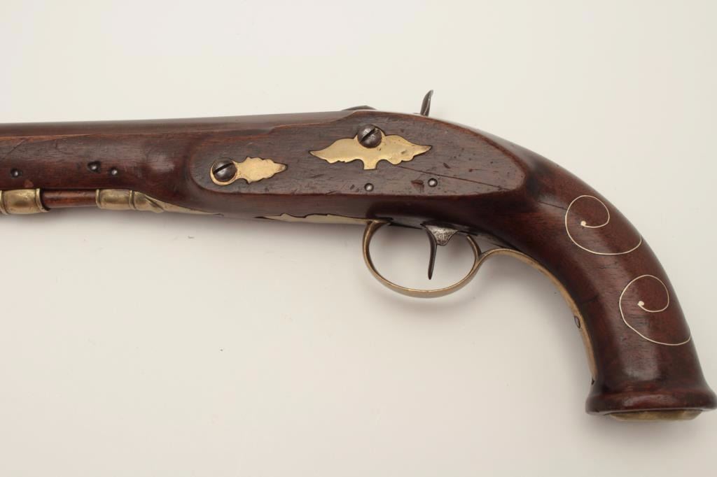 Germanic percussion pistol signed in gold on the barrel “Goze A Metz”. Measures 12 ½” overall with a 6 ¾” barrel of about .58 caliber smooth bore. Silver wire inlaid in the stock with horn tipped fore end andramrod. Near fine condition with brown and case hardened finishes. (Antique) Est.: $600-$1200