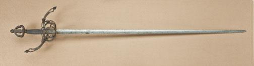 Germanic swept-hilt rapier circa approx. 1620. This exact sword is pictured in Stone’s Glossary, page 525, figure 6. This sword was formerly in the Metropolitan Museum of Art donated from the collection of John Elliott Sr, York PA. Sold by Parke Bernet Galleries, 1962. The sword measures 47-1/2” overall with 40” blade. The blade measures approx. 1” across the ricasso. The blade shows a cross surrounded by four circles on each side, which was probably the armorer mark. The hilt shows good piercing and decoration in terminates in a tapered ball design with crosshatching, matching on the ends of thee quillon and pommel. The grip is an old replacement using sharkskin, The hilt shows a crack in the back of one quillon. The hilt and pommel shows some good quality forging, some light to moderate erosion and light to moderate pitting. The blade is very good plus to near fine with just some light pitting and dried oil and would clean nicely. A very attractive period rapier which just needs the handle rewrapped with wire in the proper form. Est: $6,000 - $12,000
