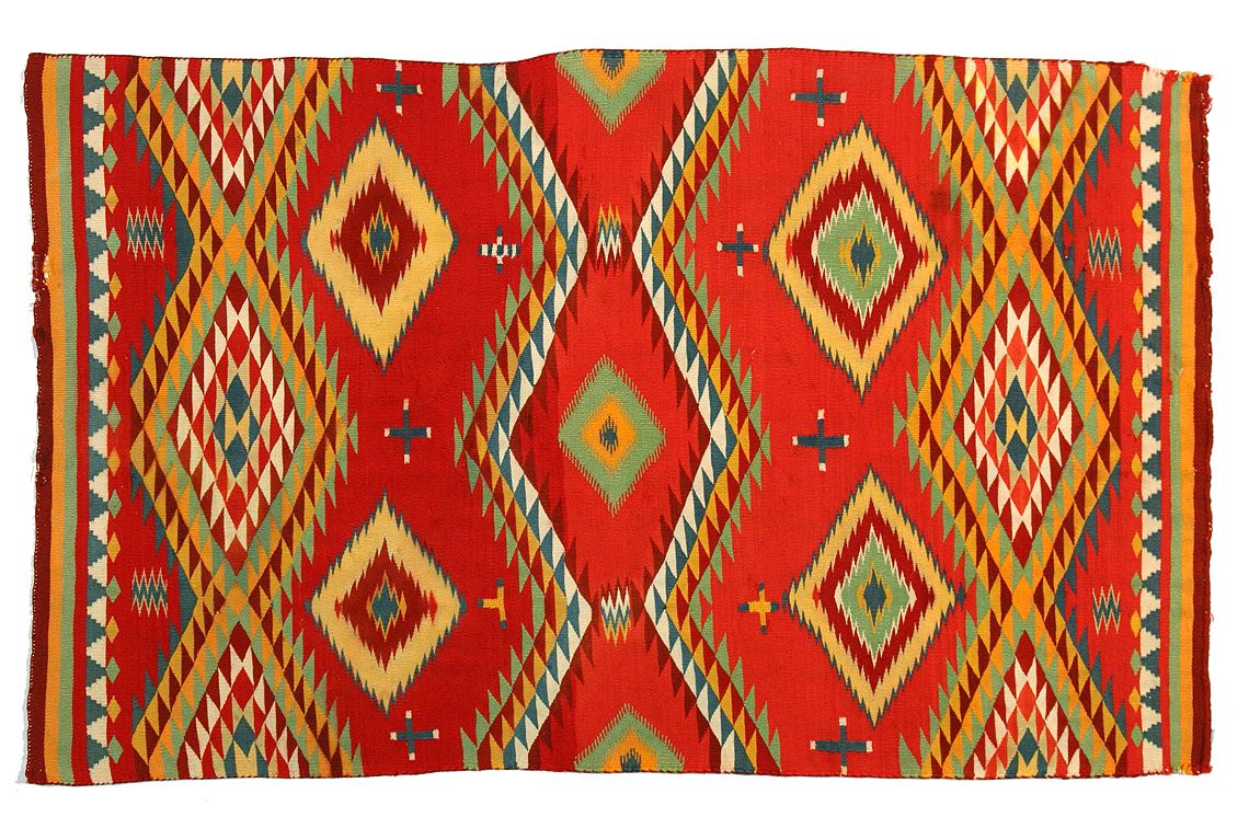 Germantown Child's Blanket . 2'8" x 4'4" finely woven eyedazzler with intermittent crosses. Circa 1880s. (est. $4,000-5,000). CONDITION REPORTS: www.auctioninsantafe.com/docs/cr2012.pdf