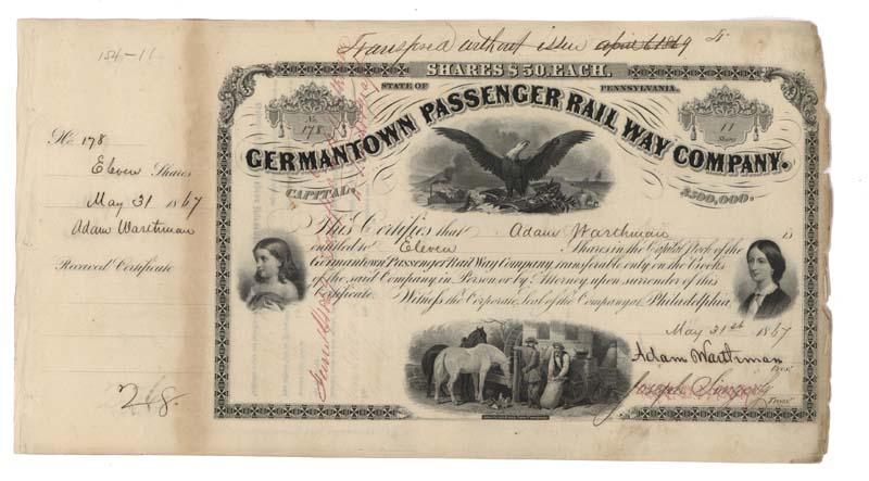 1867, Pennsylvania. Stock certificate for 11 shares. Black. Fine engraved vignette of spread eagle at top, horses and men at bottom, woman at right and child at left. Pen cancelled and extremely fine.