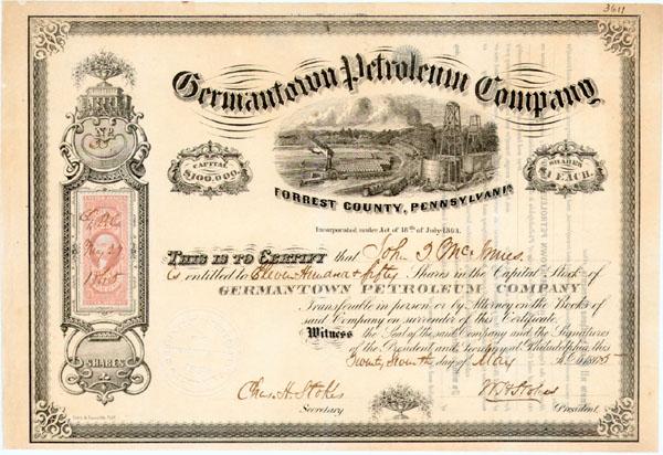 1865, PA. Stock certificate for 1150 shares. Black. Vignette of an oilfield with derricks and storage tanks adjacent to a river with a steamboat loading oil barrels. Lithographed by Stein & Jones, Philadelphia. Attached adhesive revenue at left. Folds. Uncancelled and Fine.