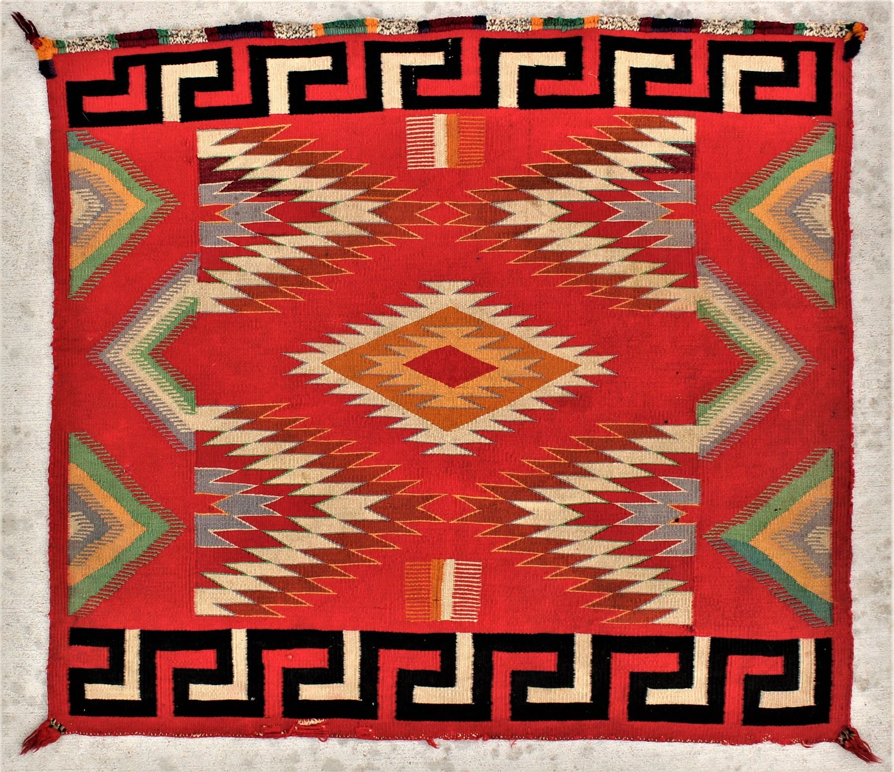 Bold coloerd single saddleblanket with eye dazzling geometric pattern. Measuring 30" x 33".