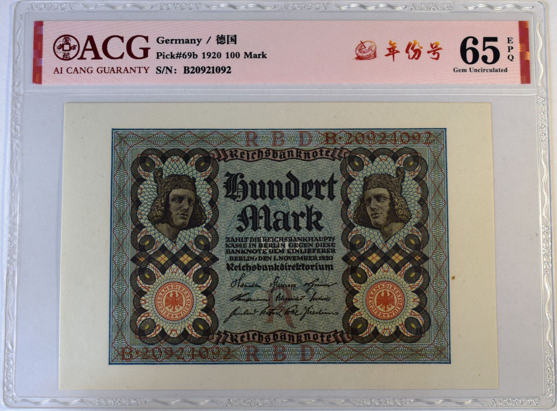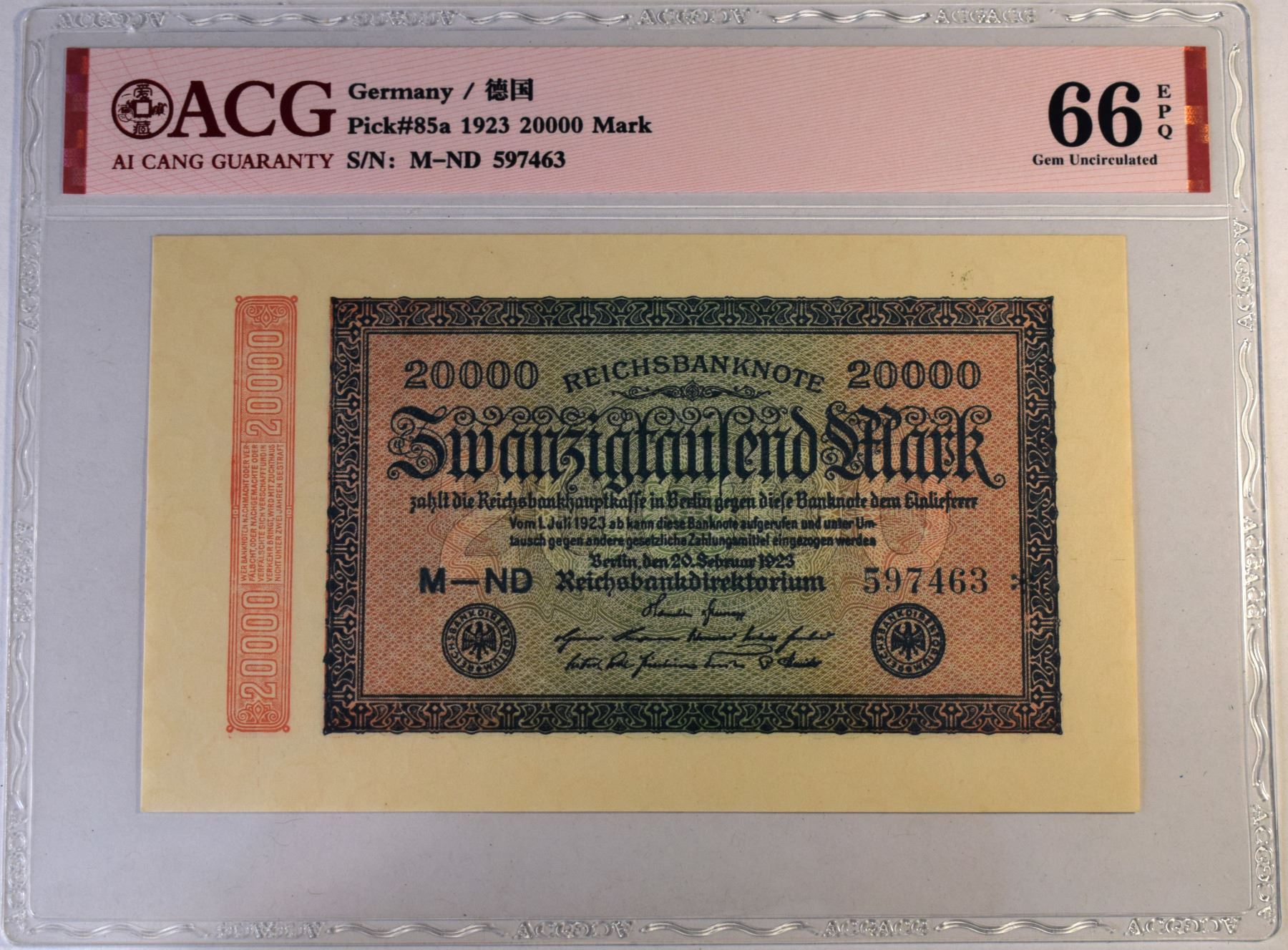 Germany 100 Mark 1920 Gem-UNC 65 and 20000 Mark 1923 Gem-UNC 66 Both "EPQ" ACG Certified