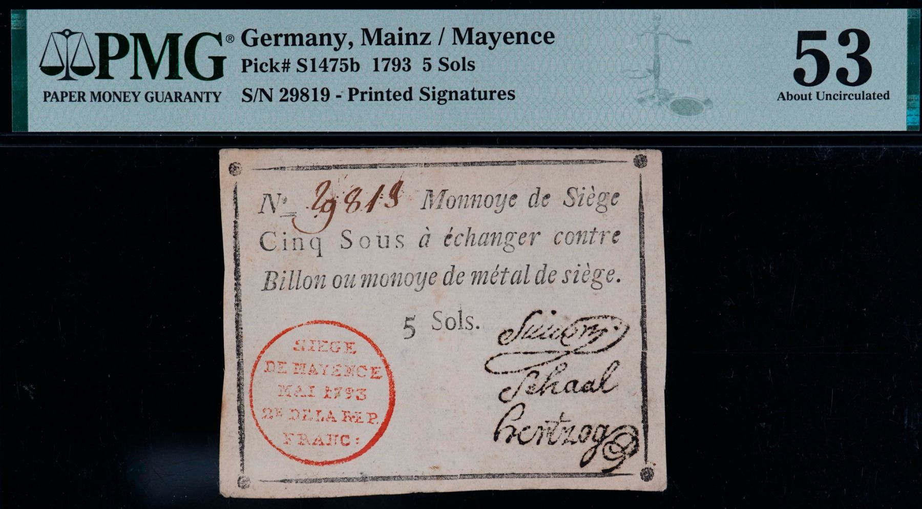Germany; 1793 5 Sols Pick# S1475b - Printed Signatures, PMG AU53