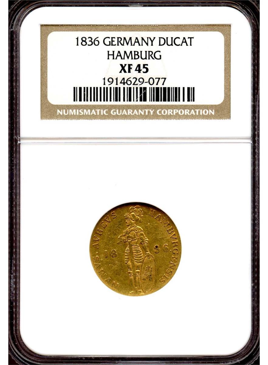 Germany 1836, Gold Ducat, Hamburg, Knight in Armor with Shield, NGC certified XF-45