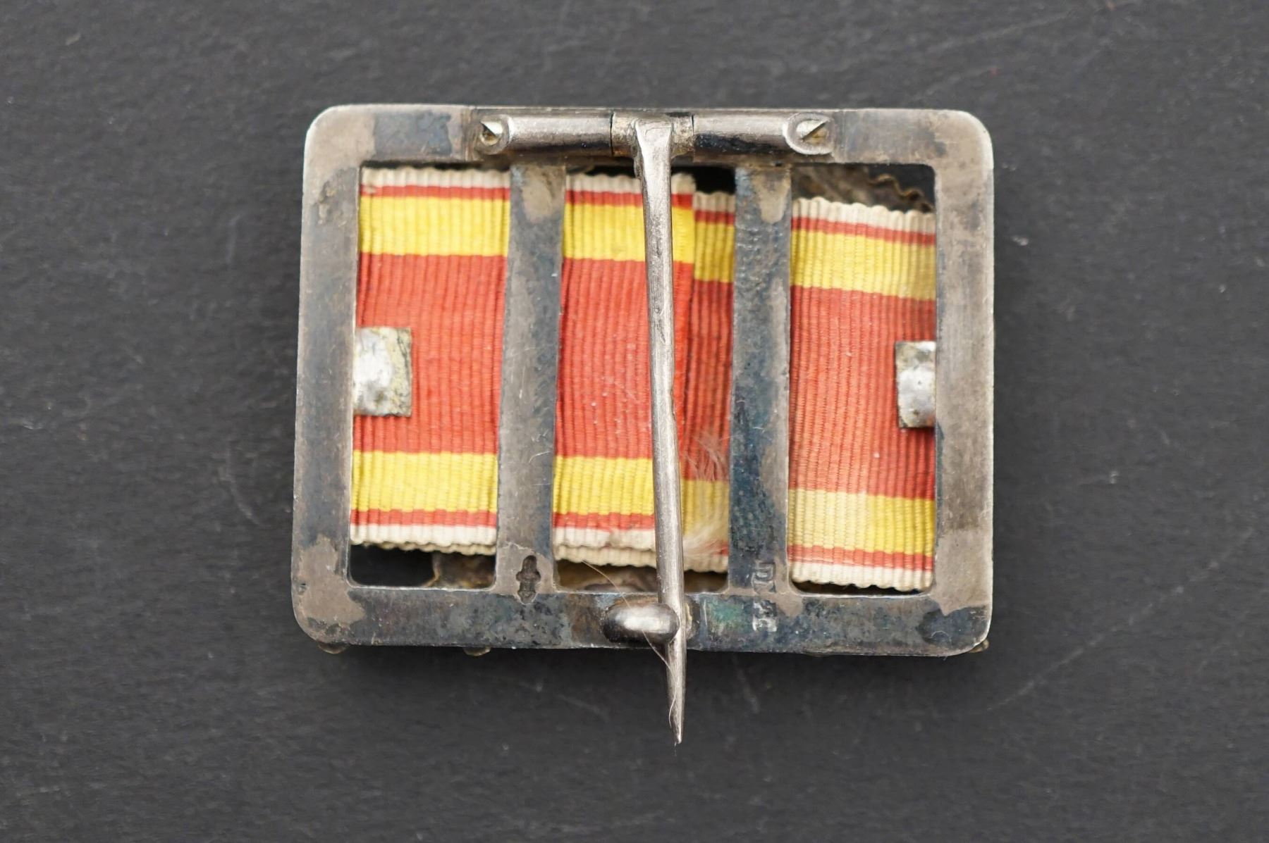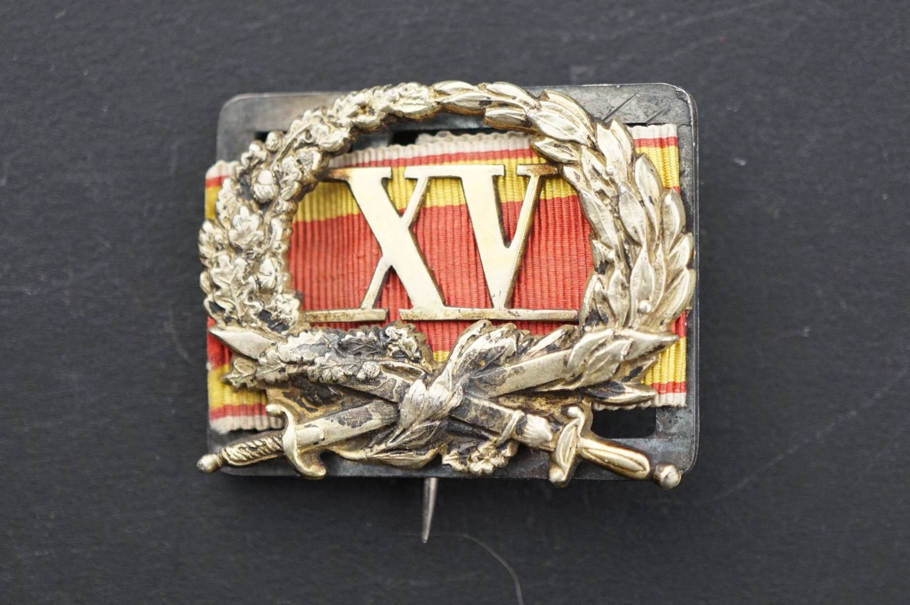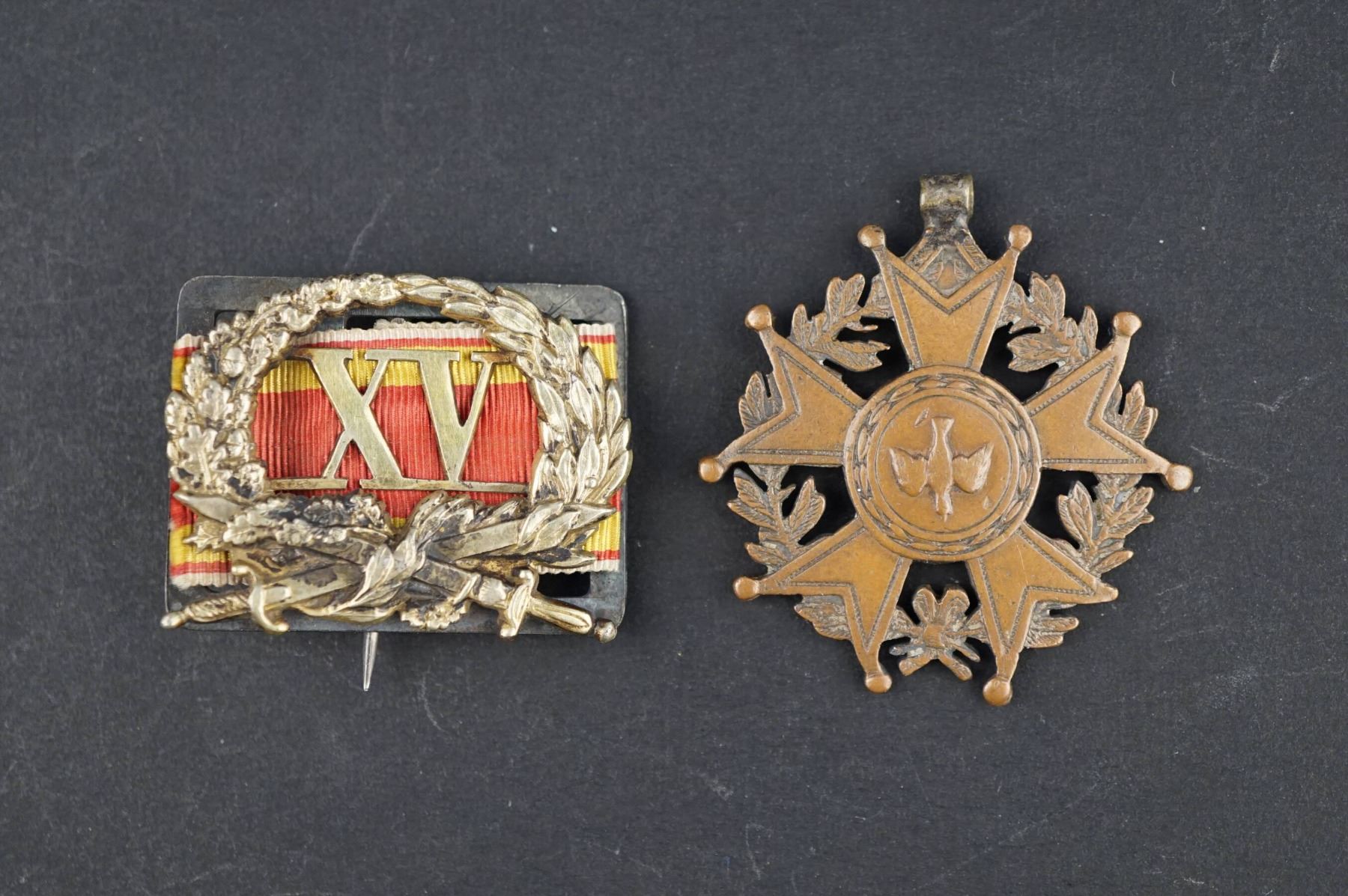Mecklenburg 15 years Service Pin, AR-35, with ribbon and reverse marks. Plus unknown brass. Au Merit 5 star with wreath.
