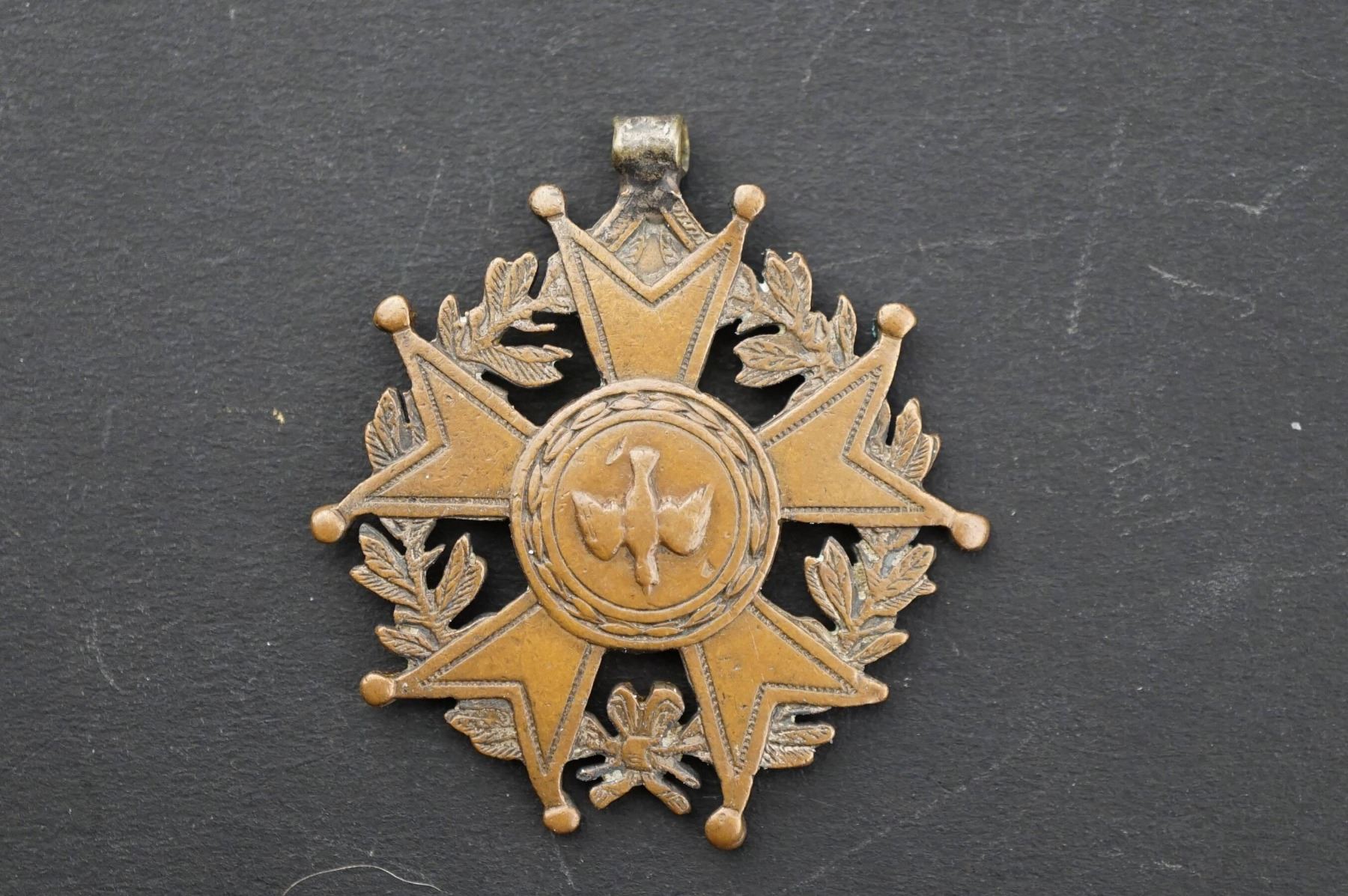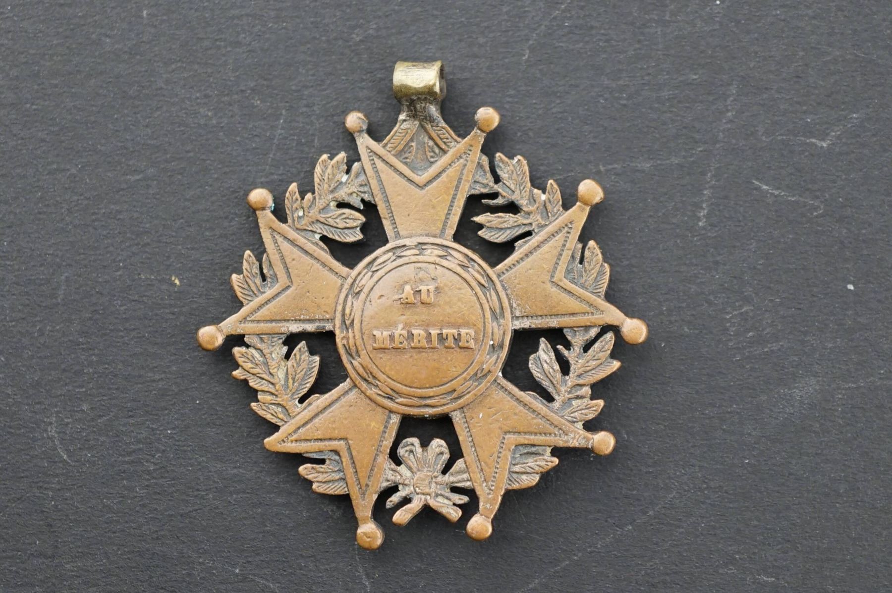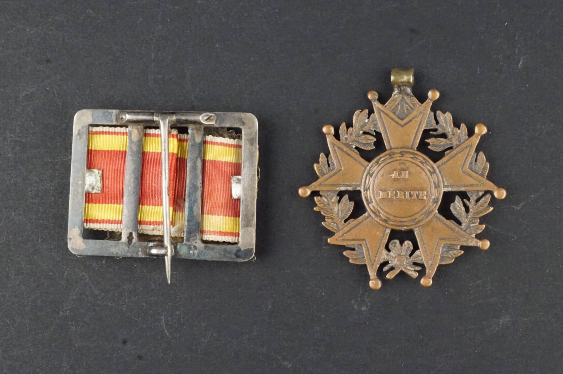 Mecklenburg 15 years Service Pin, AR-35, with ribbon and reverse marks. Plus unknown brass. Au Merit 5 star with wreath.