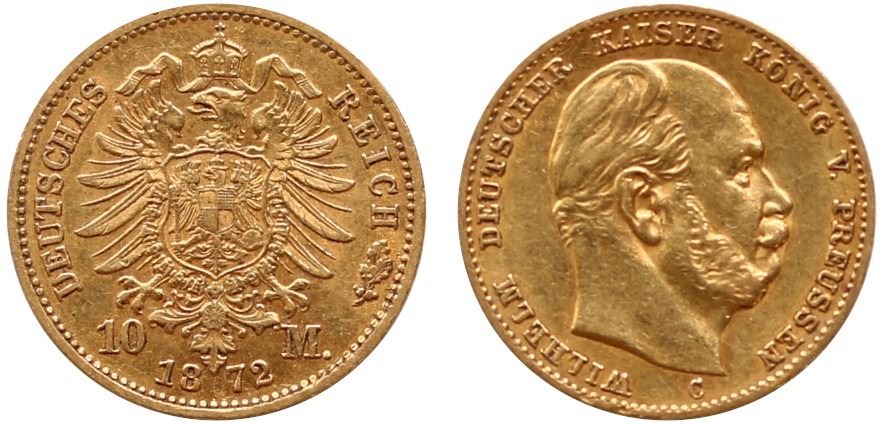 Germany; 1872 10 Marks "Wilhelm" @KM1232 VF or better.