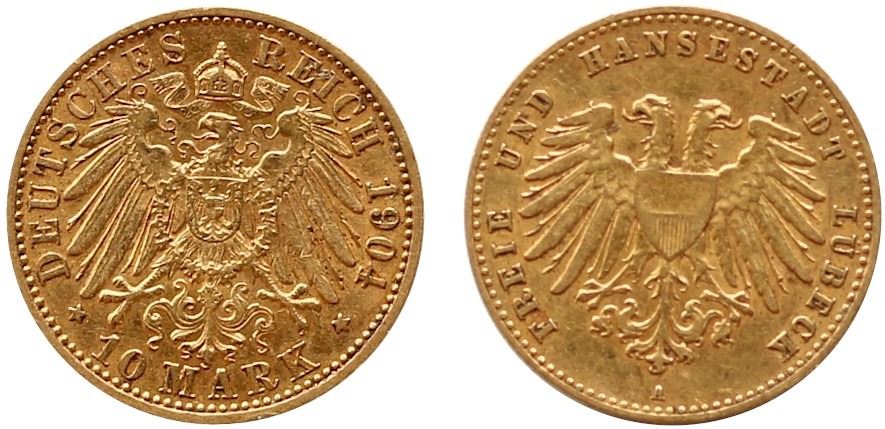 Germany; 1904 10 Marks "Hansestadt Lubeck" @KM211 VF or better.