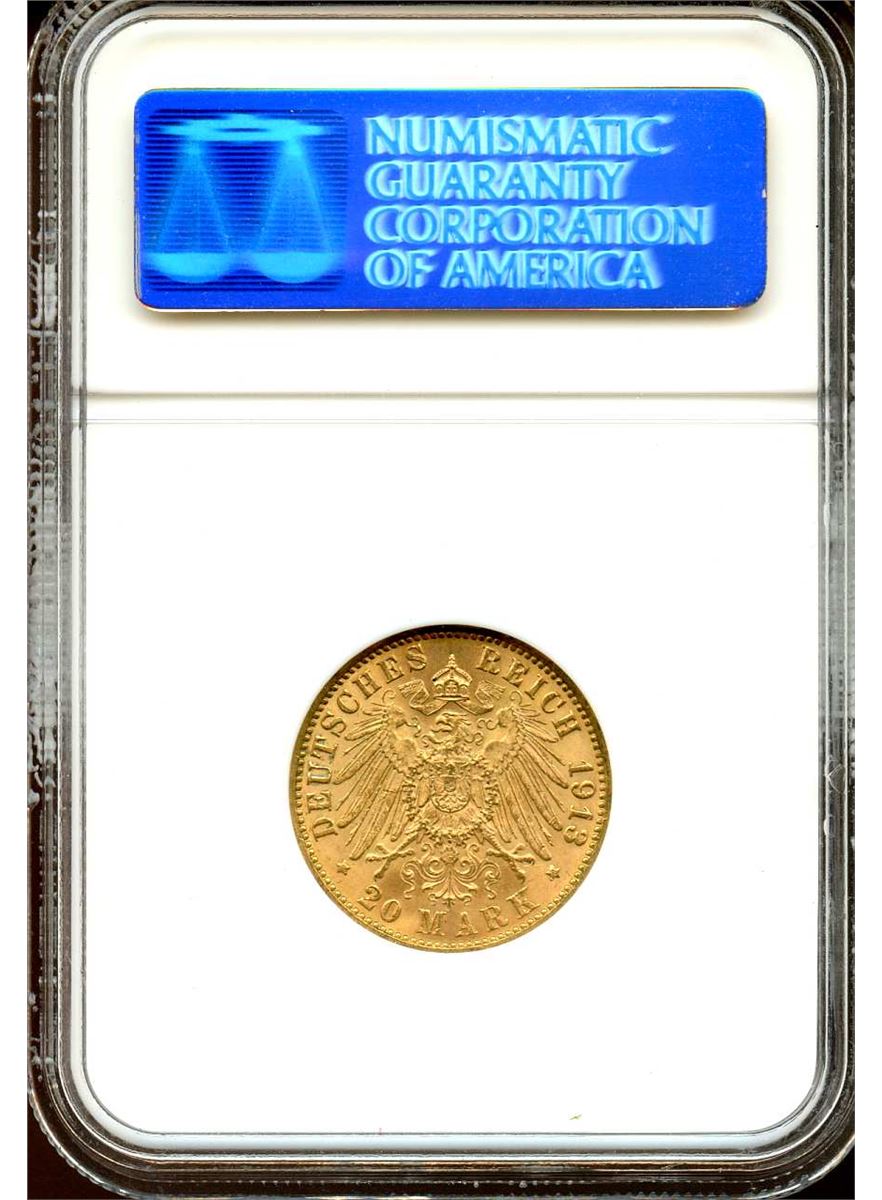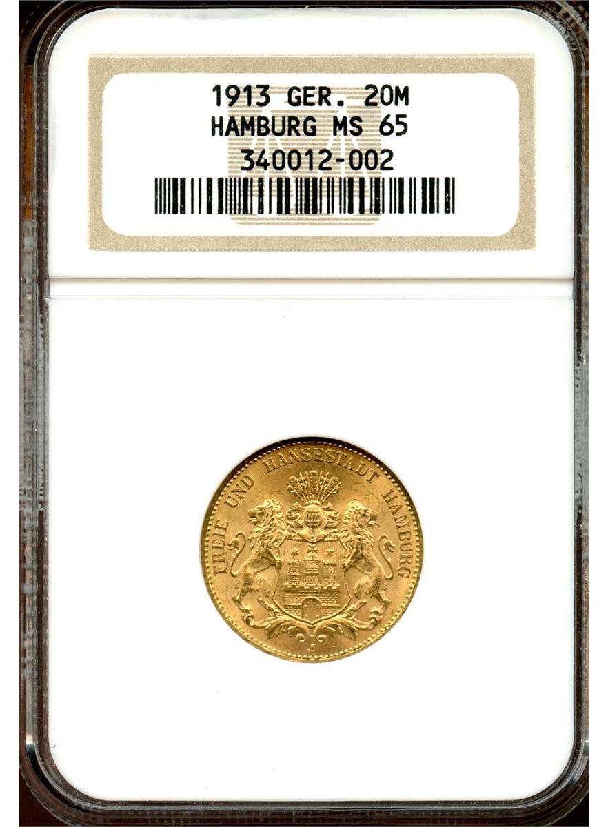 Germany 1913, Gold 20 Marks, Hamburg, KM 618, Great gold color and nice luster, NGC certified MS-65 Gem