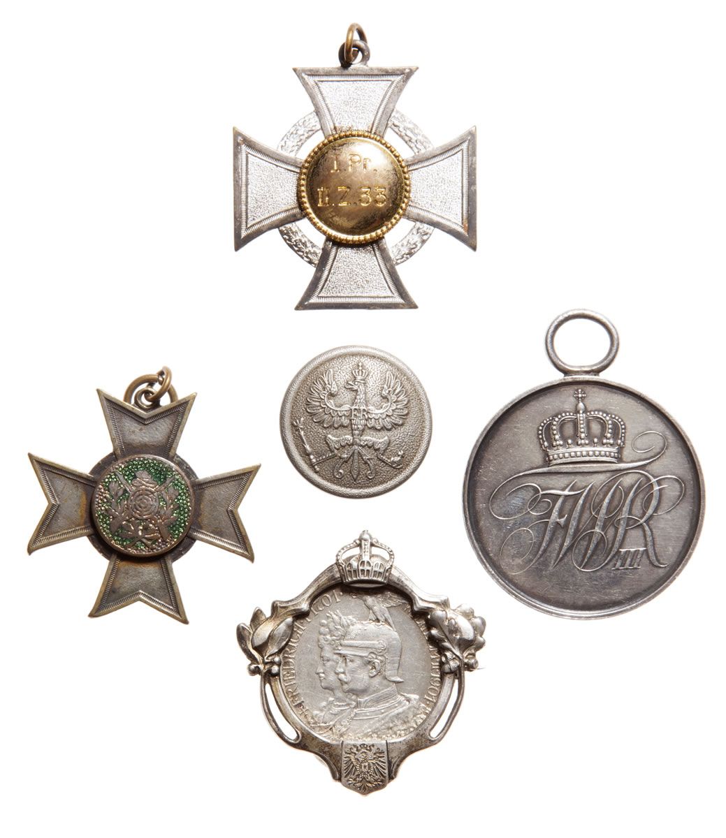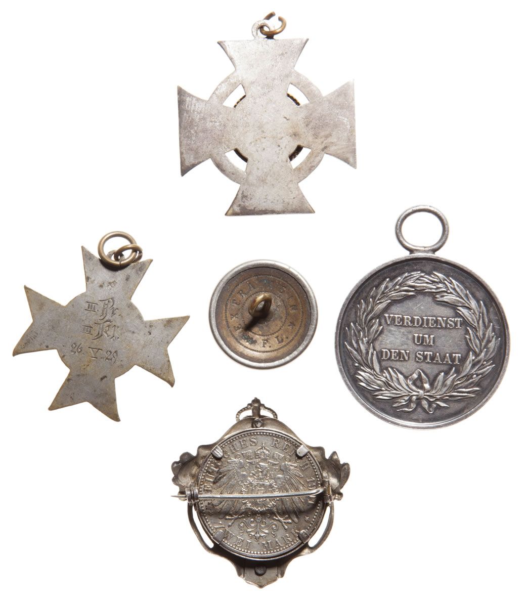 WWI Prussian General Honour Award class II, 40mm silver, FWR cypher; together with silvered sharpshooting crosses x 2, button and silver sweetheart brooch. Lot of five (5) pieces.