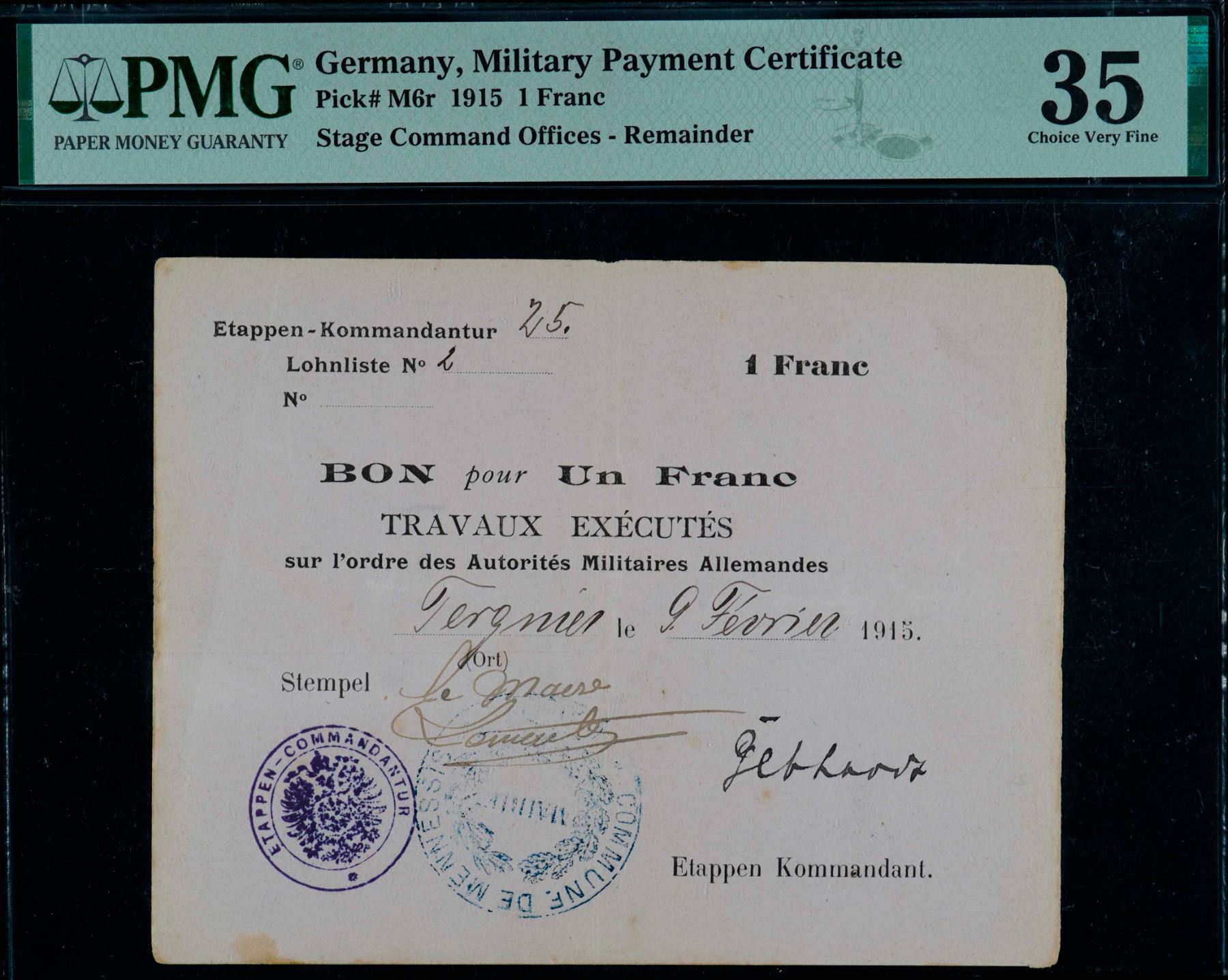 Germany; 1915 1 Franc Pick #M6r Stage Command Offices - Remainder, PMG VF35