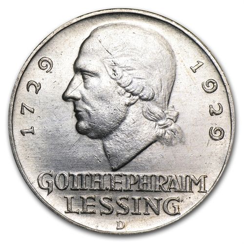 Germany 1929 3 Reichsmark Silver EF/AU Lessing **|**|** Year: 1929 ; Mint Mark: EF/AU ; Grade: Varies ; Denomination: 3 Reichsmarks ; MSRP: $100